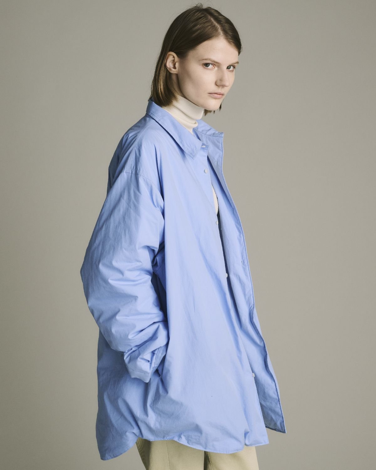 「ええーっ!?」という感じでしたね。「シャツにダウンって、どうなってるの!?」って(笑)。私たちが最初に作ったのはシャツだったんですよ。コンセプトに沿って、どんなアイテムにダウンが入っていたら面白いかを挙げていったんです。長く愛されるオーセンティックなアイテムを軸に考えたときに、「シャツなのにダウン」ってすごく面白いんじゃないかと。アウターとして捉えれば長い期間着られるとか、シャツなら洗えたらいいねとか、いろいろ考えながら試作を重ねていきました。試行錯誤して完成させたのが「OVER DOWN SHIRTS(オーバーダウンシャツ)」です。オーバーサイズなのでアウターとして様々なコーディネートを楽しめ、軽量で、インナーにTシャツを着るだけで十分にあたたかい。インナーダウンが要らないんですね。寒くなるにしたがって、Tシャツを半袖から長袖へ、長袖から例えばタートルへ、ニットへと変えていき、マフラーを巻けば、気候にもよりますが12月ぐらいまではカバーできます。ファーストシーズンから売れ筋の一つで、ミフューの「顔」になっているアイテムです。