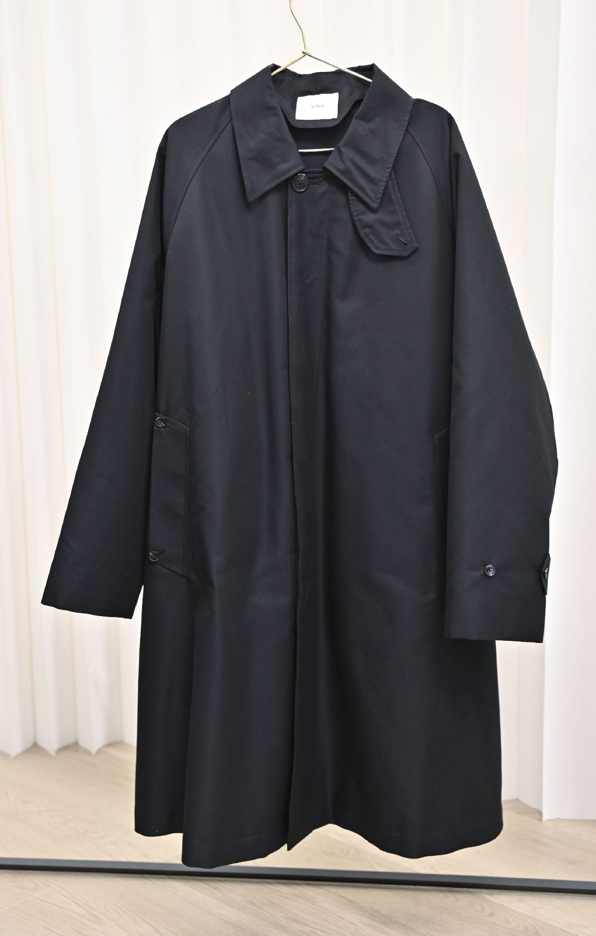 そうなんです。フラシはステンカラーコートにも採用しています。表裏を縫い合わせると、ダウンの膨らみと表地の張り感で吊れてラインができてしまうのが、どうしても嫌だったんですね。バックのフレアやベントがしっかり出ていることがステンカラーの魅力であり、それがダウンコートに見えないポイントだと思ったので、あえて浮かせる仕様を選びました。