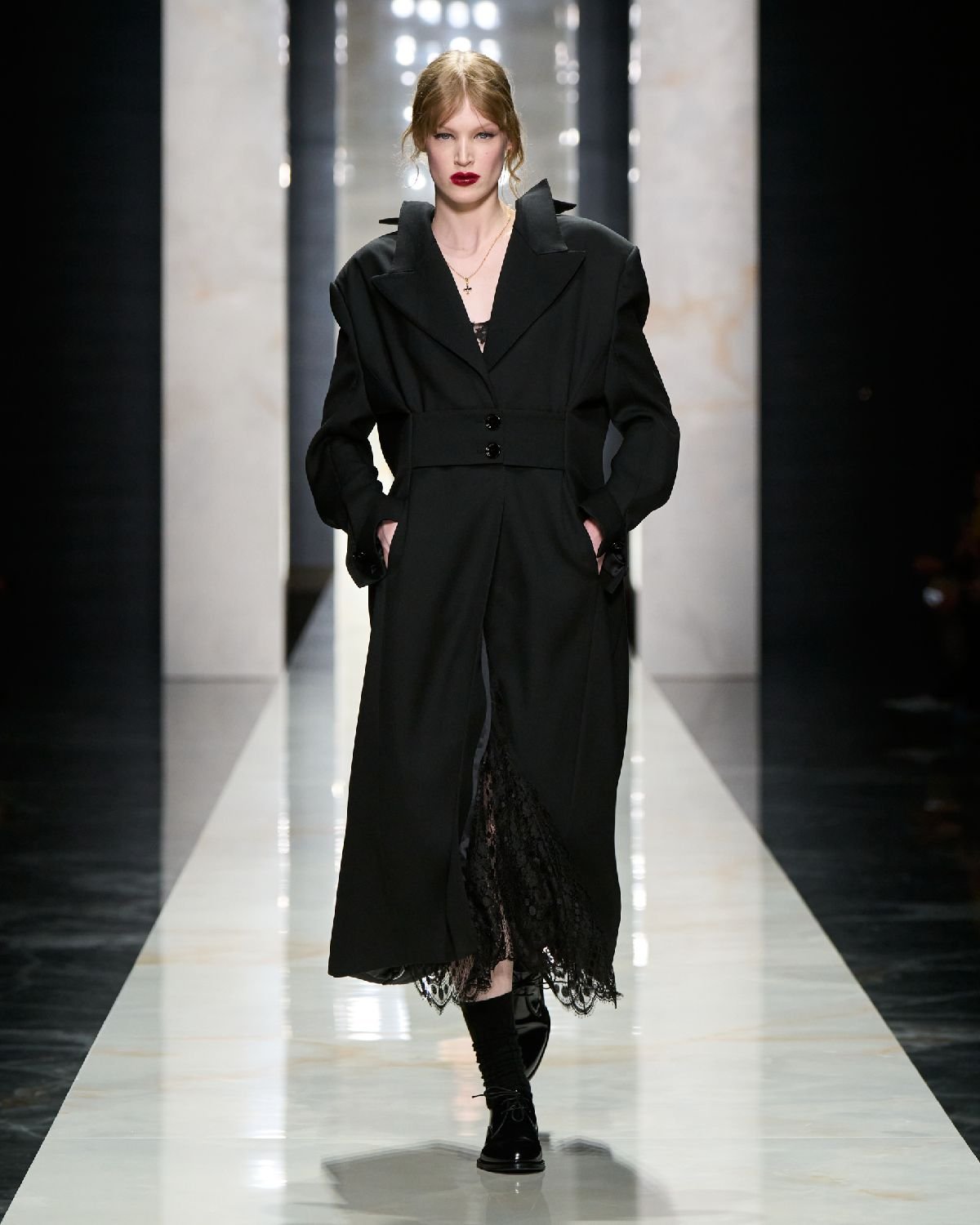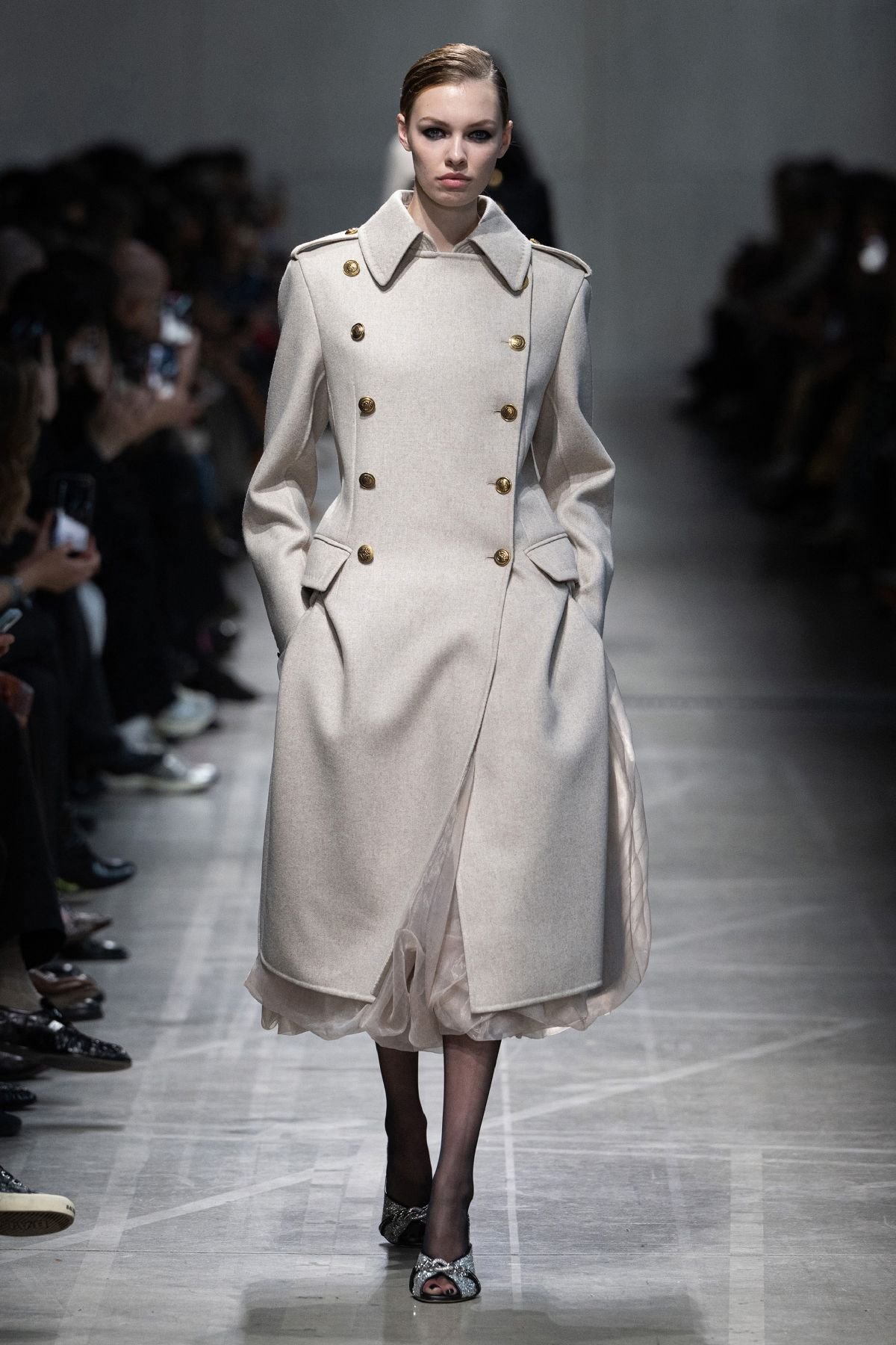 「History and Modernity(歴史と現代性)」をテーマに「カノッサの屈辱」の仕掛人である11世紀イタリアの女性貴族、マティルダ・ディ・カノッサをミューズとしたコレクション。敏腕外交官かつ軍司令官であり、芸術のパトロンでもあったマティルダのイメージを、ブランドのアイコンコート「101801」に重ね、アウターに注力した。キャメル、カシミヤ、アルパカ、モヘア、上質なウール、光沢のあるダブルフェイスによるミリタリーテイストのマキシコート、ショルダーを強調したアワーグラス型コートやドレス、アイコニックなテディベアコートが登場。ミニのアイテムにはハイサイブーツを合わせて露出を押さえ、潔くパワフルな女性像を繰り広げた。