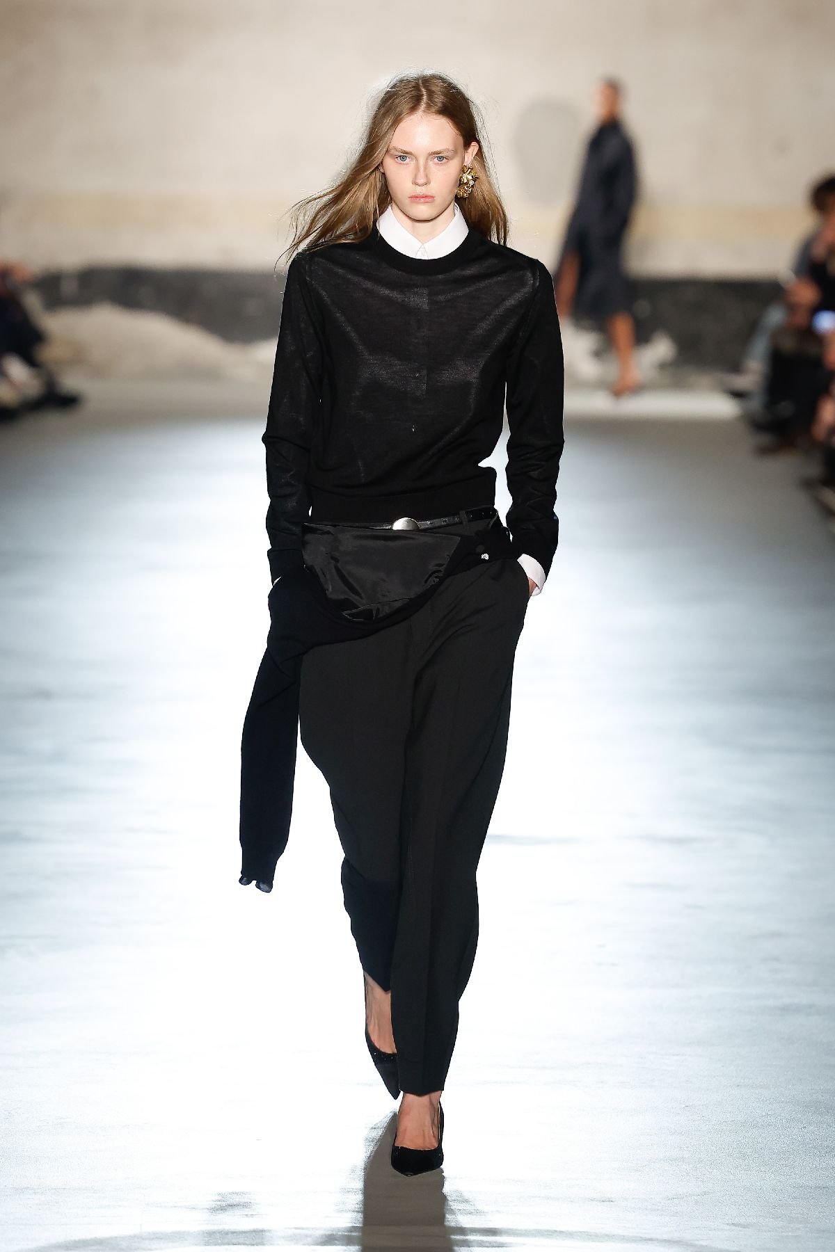 通常は全員のモデルが一気に登場するフィナーレをショーの冒頭で行うという、意外な演出でスタート。フランス人アーティストのソフィ・カルがホテルでメイドを装って宿泊者の部屋を撮影した写真からのインスピレーションで、「日常的な女性らしさ」をテーマに女性服の美的要素を描写した。片方だけ袖を通してブラ見せをしたり、トラウザーズにルーズにカーディガンを巻いたりするコーディネートにも日常が垣間見られる。黒を基調に、ミニマルなウールツインセットやテーラードスーツ、ダウンやスパンコールのドレスが登場。ラミネートペーパー素材のスカート、ゴールドラメドレスなどきらびやかなアイテムから、リボンのイブニングドレスや小花モチーフのシフォンドレスなどロマンティックなアイテムまで様々に揃え、多様な女性像を表現した。