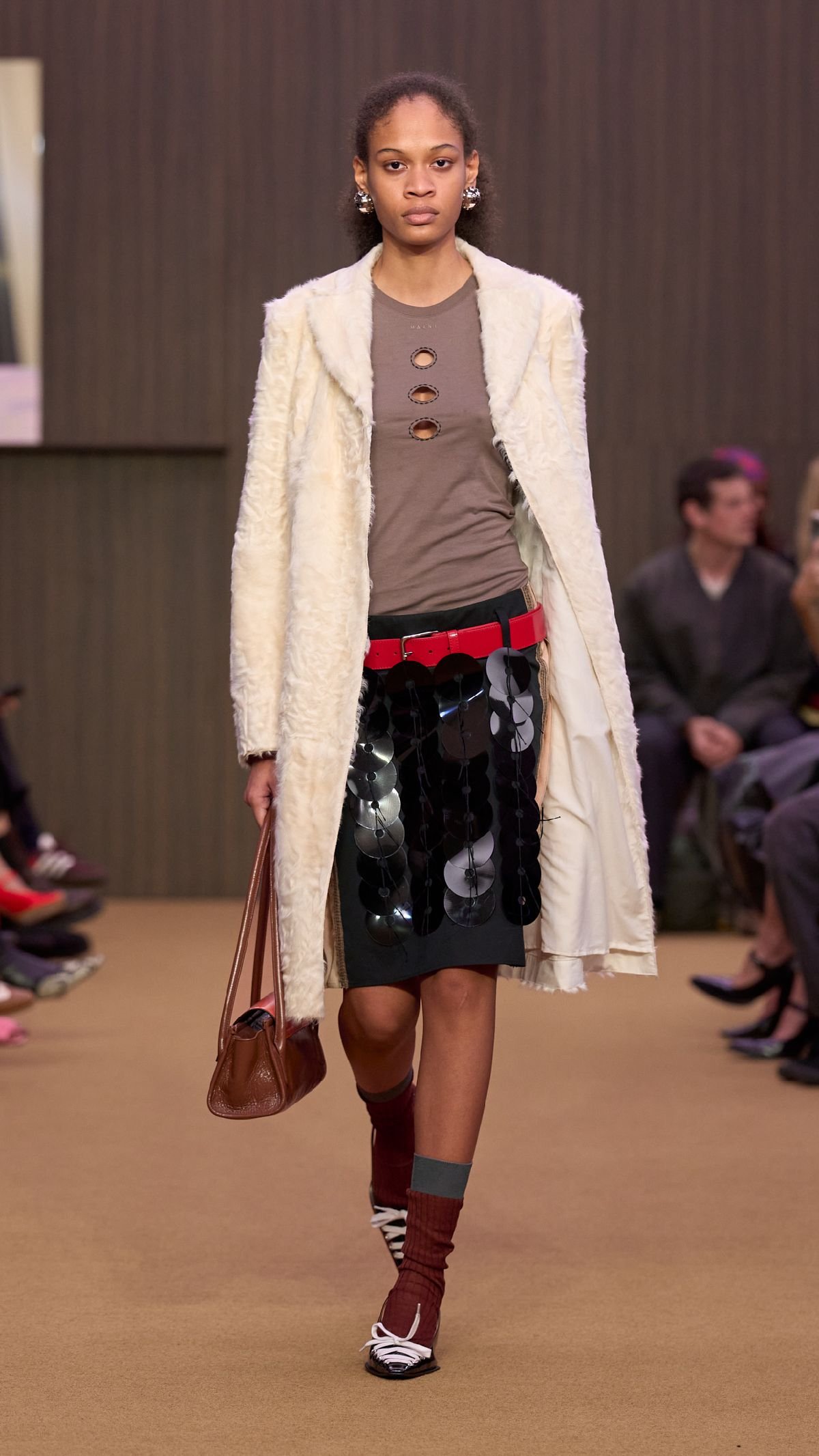 メリル・ロッゲによるデビューコレクション。デザインデュオ、フォルマファンタズマによる日常生活のモチーフを描いたセットデザインに象徴されるように、創業当時の「マルニ」を彷彿させる親しみやすく温かい雰囲気を再現し昇華させた。アイレットとポルカドット、ファーテクスチャー、グラデーションのストライプ、バイアスチェック、パッチワークなど「マルニ」のシグニチャーを生かしつつ、ウエスタンテイストやウエスト部分に裏地を使うディテールなどメリルらしいひねりも加えた。近くには山がそびえるミラノを意識したマウンテンパーカやアノラックなどアウトドアテイストから、マザー・オブ・パールのスパンコールを使ったラグジュアリーなスタイルまで、様々な要素を入れ込んだ完成度の高いコレクションとなっている。