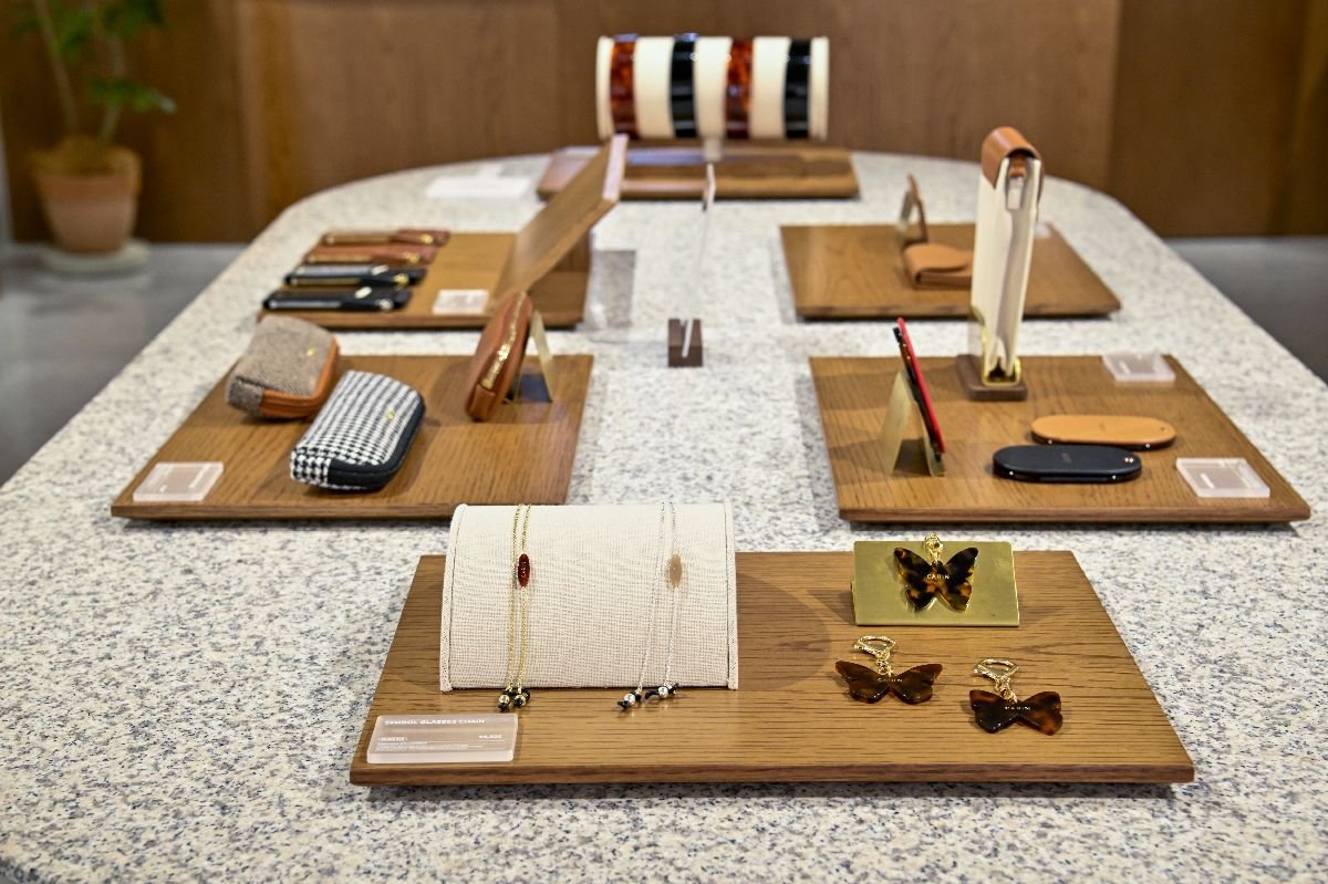 この空間で提案するアイウェアは、眼鏡が約220型、サングラスが約150型と、ほぼフルラインナップが揃う。木製の壁面には眼鏡をディスプレイし、アセテートやレアメタル、それらのコンビネーションという素材ごとにゾーニングした。大理石の壁面にはサングラスを集積し、レンズやフレームのカラーを比較しやすいビジュアルプレゼンテーションになっている。サングラスは「LOOK IN CONFIDENCE」をコンセプトに製作され、身に着けた人が自信を持て、自身をより魅力的に演出できるよう意図されている。このほか、アイウェアケースやグラスチェーン、ハンドミラー、バッグなどオリジナルのアクセサリーも揃え、「アイウェアよりも買いやすい価格なので、自分用はもちろん、プレゼント向けにも喜ばれている」。