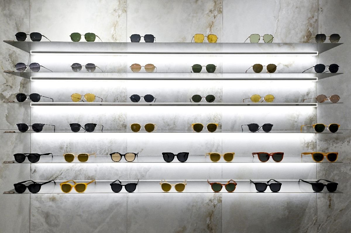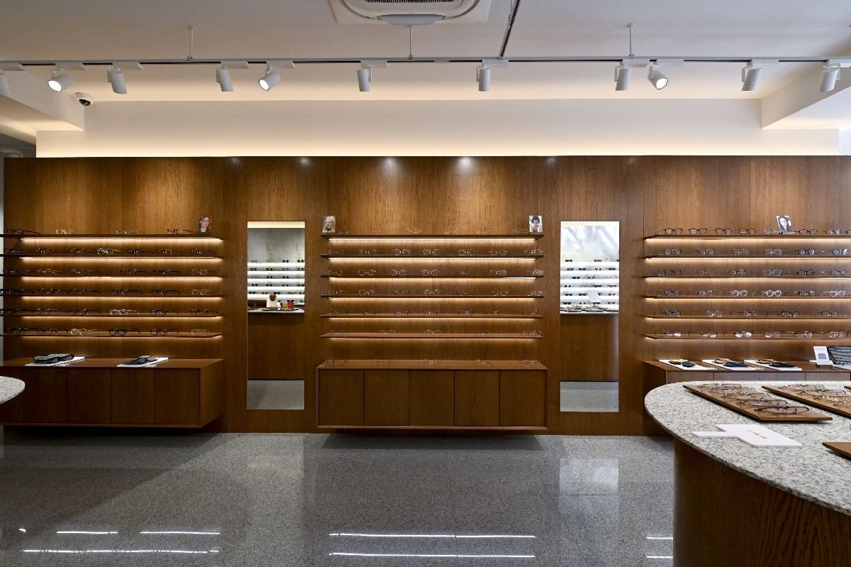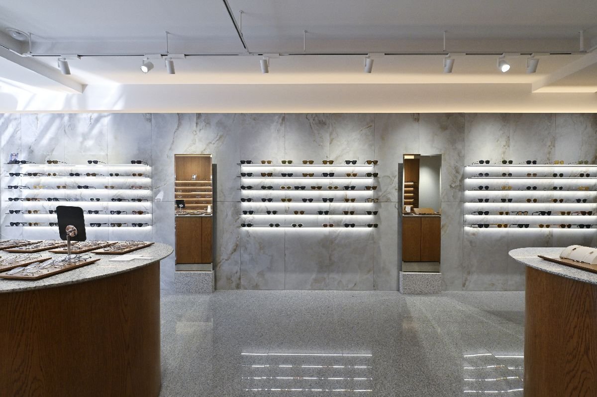 奥行きのある店内。右の壁面は木製で眼鏡を、左の壁面は大理石でサングラスを提案