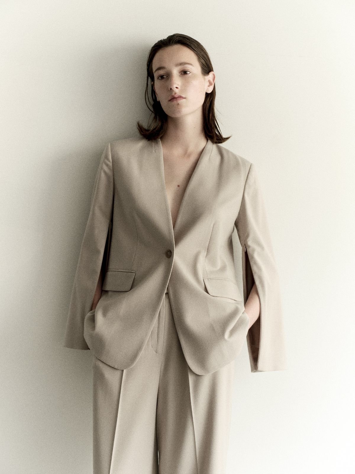 オーバーサイズの2WAYジャケット「ウール混サキソニー・スリット袖ジャケット」(3万690円)は新生ザ クラスの象徴的なアイテム。ベーシックなノーカラージャケットだが、同素材のパンツとのセットアップで着用すれば上品でモダンなスタイルを楽しめ、袖口のジップを開くとケープ風の着こなしに早変わりする。さりげなくフェミニンなムードを漂わせる「品格とモードを一瞬でスイッチングできるアイテム」だ。