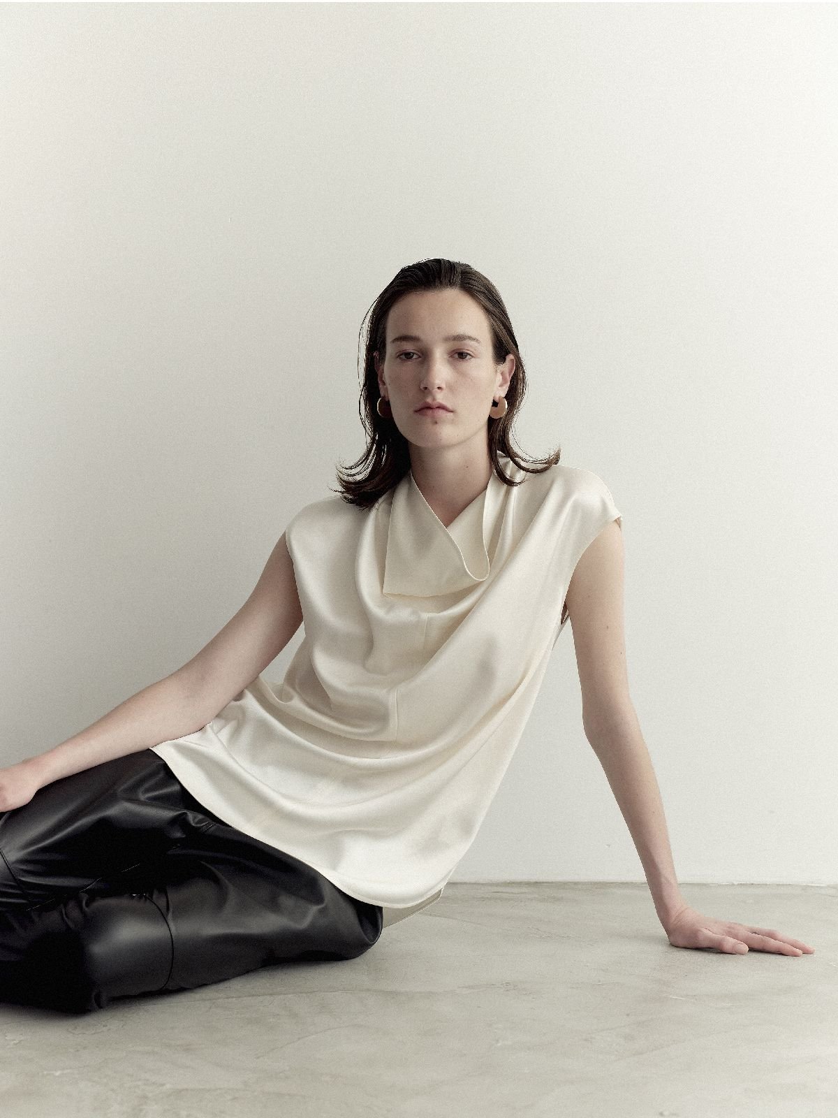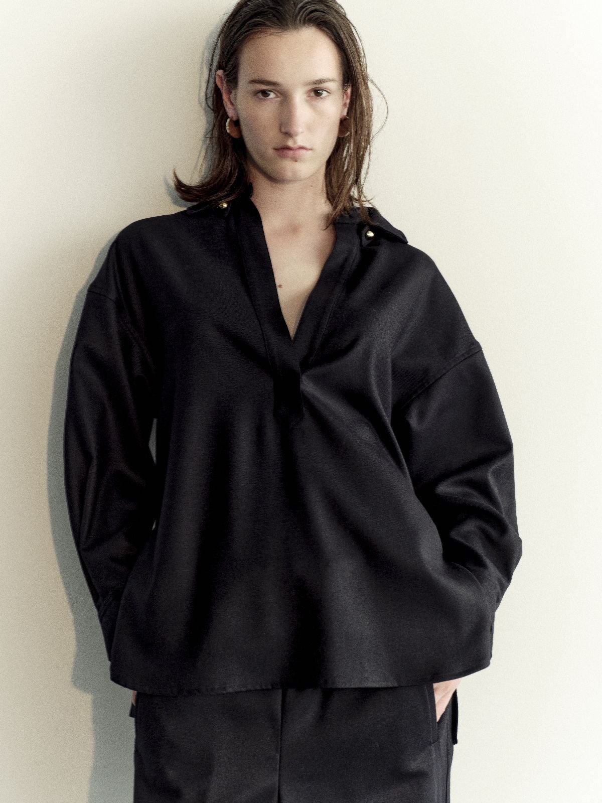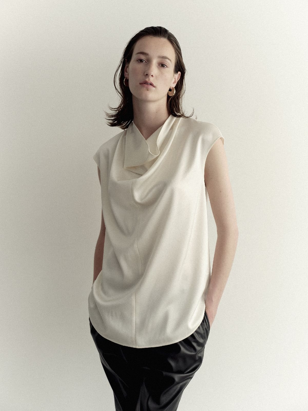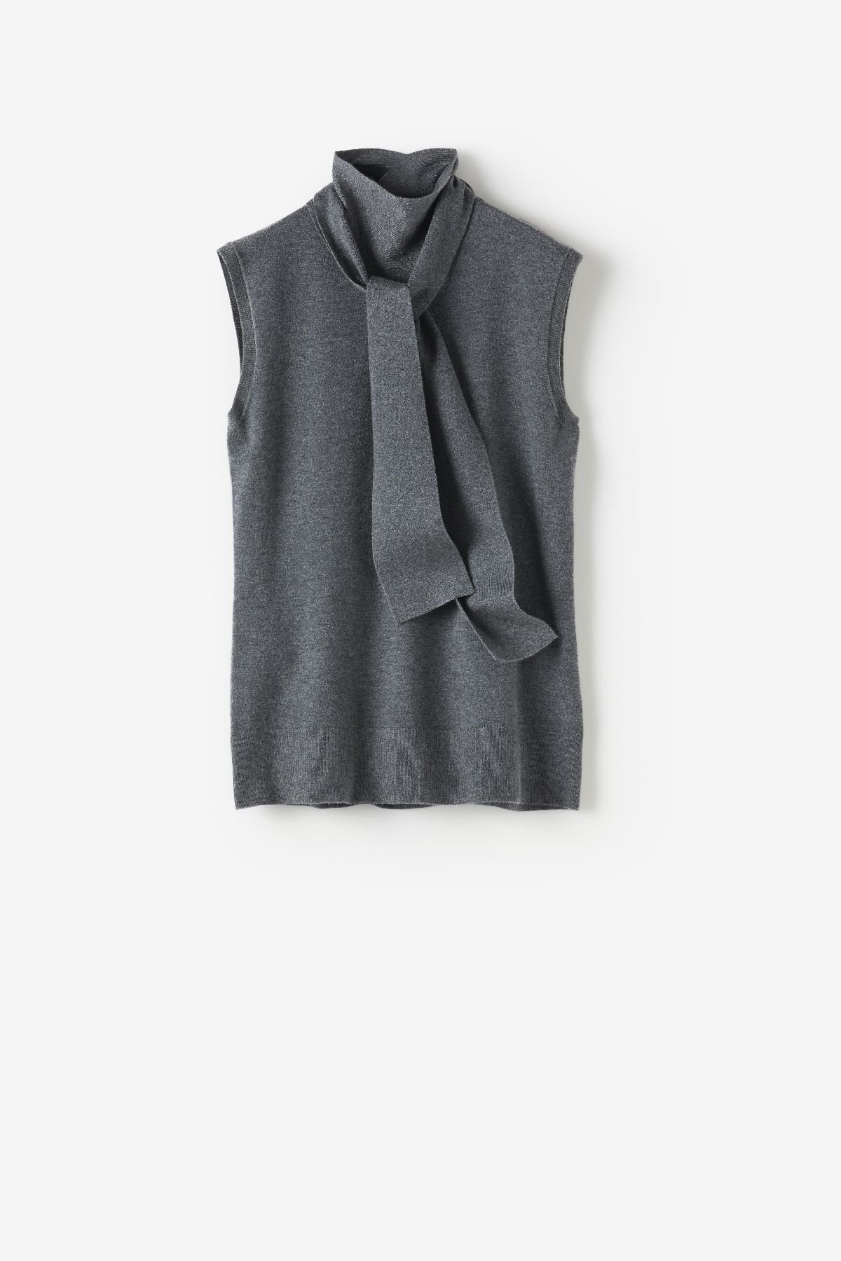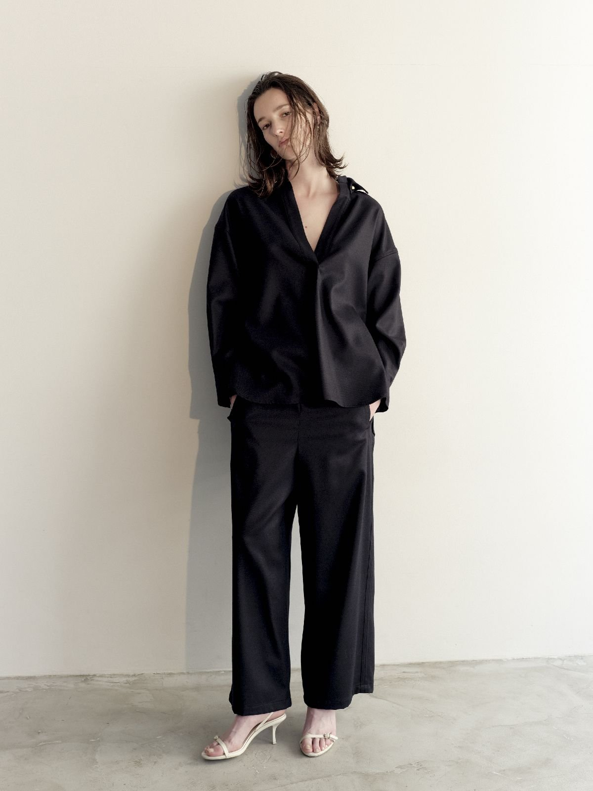 トップスは定番化していきそうなオーセンティックでコーディネートの汎用性のあるアイテムが多い。「ストレッチサテン・ドレープネックブラウス」(1万989円)は2シーズン目。サテンの艶と襟元をたわませたデザイン、優しく広がるドレープが高級感を醸し出す。「Tシャツのように着られるブラウスを意識」して作られたというブラウスは、もちろん1枚で十分に決まり、セットアップと合わせればドレッシーな装いに。素材のストレッチサテンは程よく肉厚でハリがあり、ボディラインを拾わないのも魅力だ。「ストレッチニット・ボウタイハイネック」(8780円)も注目。総針編みによる程よい肉厚感とハリの美しさを備えたノースリーブのニットは、ハイネックに長めのボウタイを組み合わせ、結べば華やかに、ストールのように垂らせば知的に着こなせる。「高密度フラノ・スキッパーブラウス」(1万9690円)は、深いVネックと襟を抜いたデザインをオーバーサイズで品良く表現し、あえてラフに着ることで大人の女性にこそ似合うリラックス感溢れる1着に仕上げた。同素材の「高密度フラノ・ドロストワイドパンツ」(1万9690円)は総ゴム仕立てで快適に穿け、ドロストで自分好みのサイジングも楽しめる。