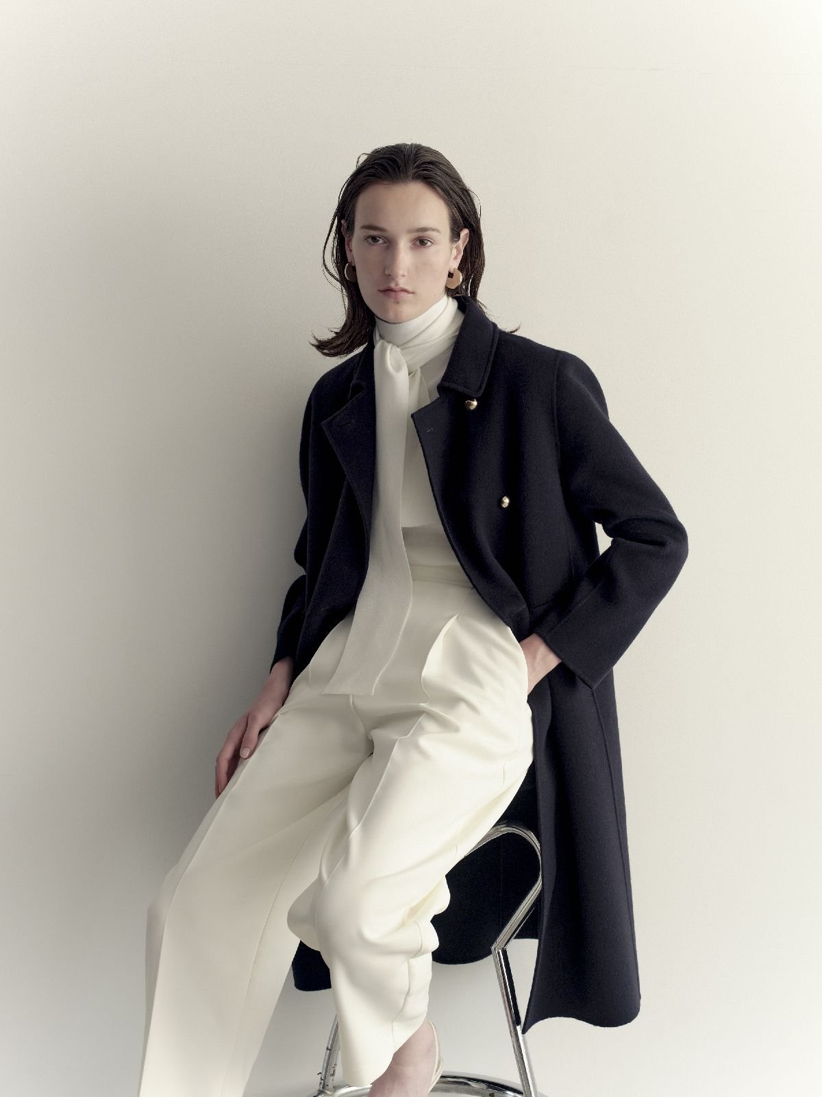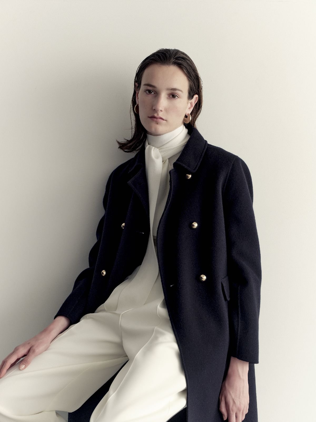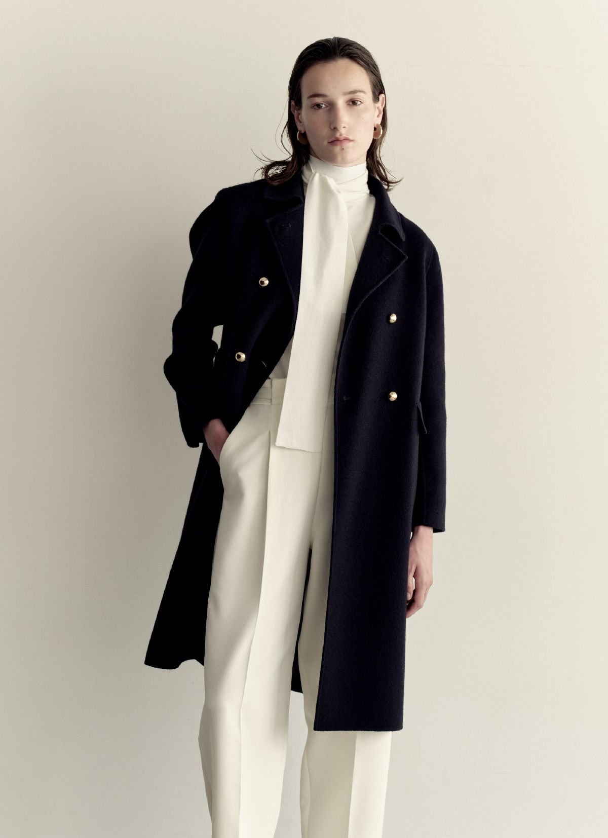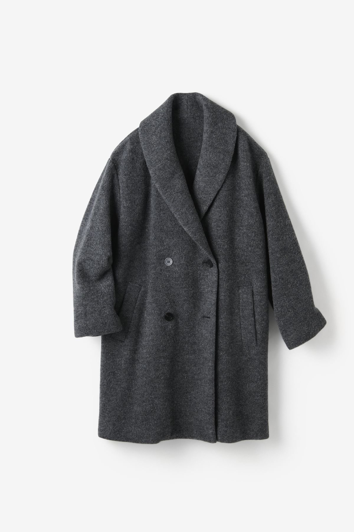 ウールリバーのコートは毎シーズン、大人の女性の冬の王道スタイルとして提案している。著名メゾンのウールリバーを手掛ける工場と直接やりとりし、今季はカシミヤ混ウールとピュアウールの2タイプのダブルフェイス生地を生産。職人のハンドワークで一点一点、根気強く丁寧に縫製した。工場の閑散期に発注することでコストを下げ、ロングコートでも4万円台前半(税込)という驚きの価格を実現している。「リバー仕立ての生地は重くなりがちなのですが、身体の線を拾わない程度の肉厚感があって軽いということに焦点を当てて開発した」と原田さん。メンズライクに仕立てたダブルブレストのロングコート(4万3890円)はジャストショルダーにやや細身のシルエットで、今季から取り入れた金ボタンが華やかさを添える。