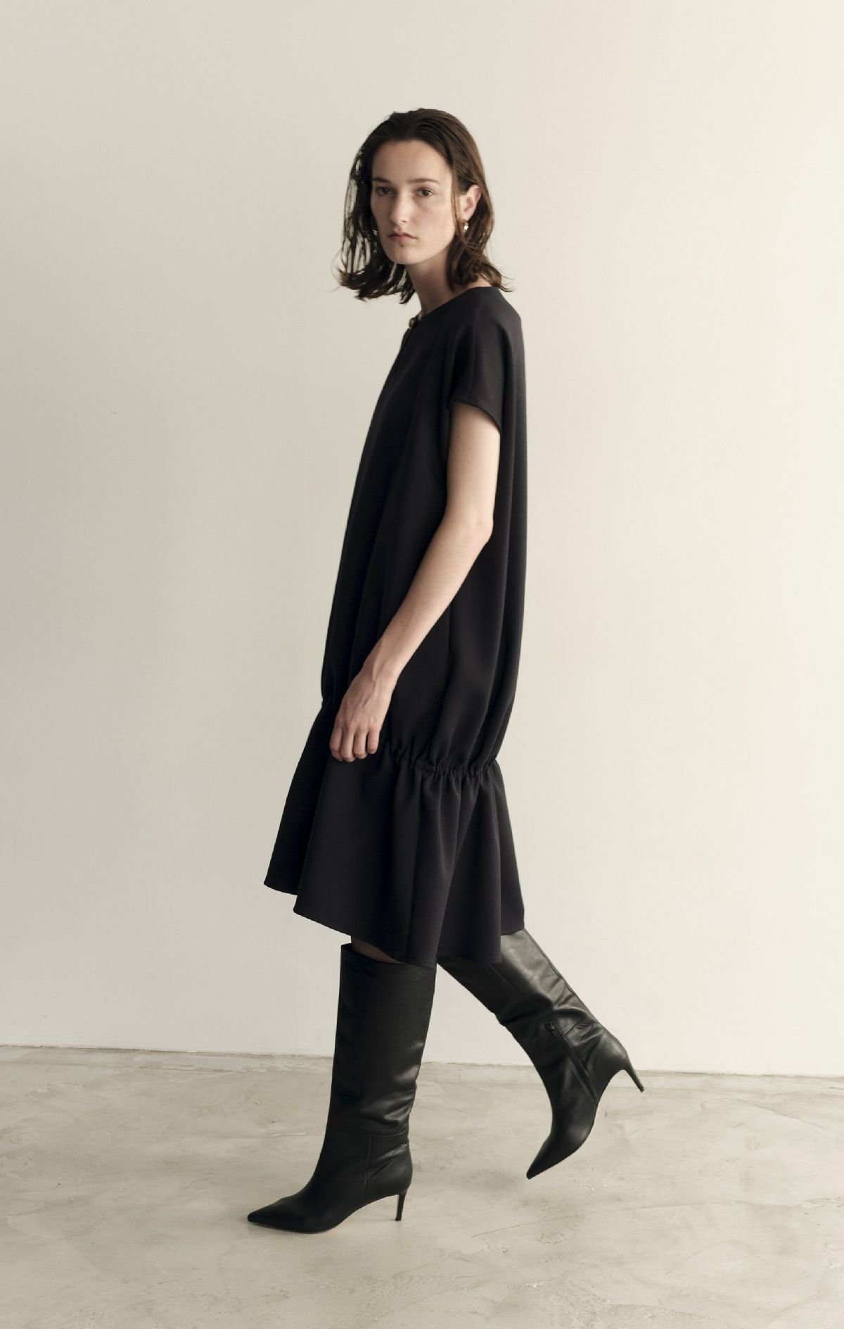 「二重織ストレッチ・コクーンワンピース」(2万6290円)はギャザーをたっぷり寄せた裾のフォルムが愛らしく、大きく切れ込みの入ったネックとフレンチスリーブが特徴的。暑い時期は羽織るだけで決まり、秋はカットソー、冬はタートルなどレイヤードも自在で、ロングシーズンの着用を楽しめる。その形状から原田さんが「クリオネ」の愛称で呼び、スタッフ人気も高いアイテムだ。「働く女性が増えた中で、朝に迷わずサッと着られて、一発で決まることはコレクション全体で重視していることの一つ」という。