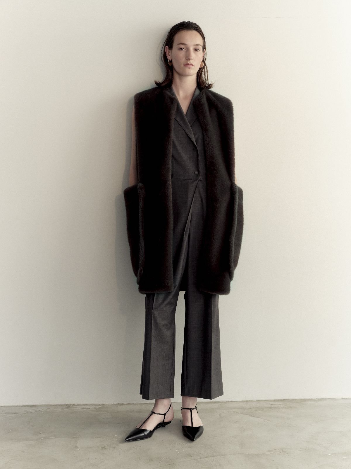 着るだけでおしゃれ度が上がると人気なのが「エコミンク・異素材ジレ」(3万2890円)。前身頃に最高級毛皮の代名詞とされるミンクファーを完全再現した「エコミンク」を使い、贅沢なジレに仕上げた。後身頃はジャージーに切り替えることで、着姿がボリューミーになり過ぎず、バックもすっきりとして軽い着心地を生む。