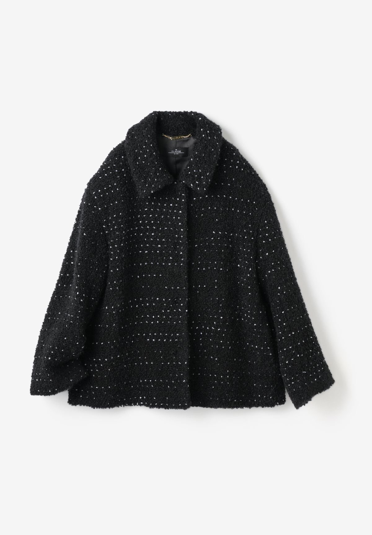 クラシカルモダンのトレンドが継続する中で、ツイードにも工夫を凝らし差別化を図った。「ミックスツイード・ジャケットブルゾン」(4万3800円)は、ノット糸によるオリジナルのファンシーツイードを使用。ドロップショルダーを採用し、ツイードジャケット特有の硬さを和らげた。生地目からチラチラッと輝きがのぞく黒と白のシックなモノトーンのツイードは、コーディネートするボトムによってマニッシュにもフェミニンにも着こなせる。