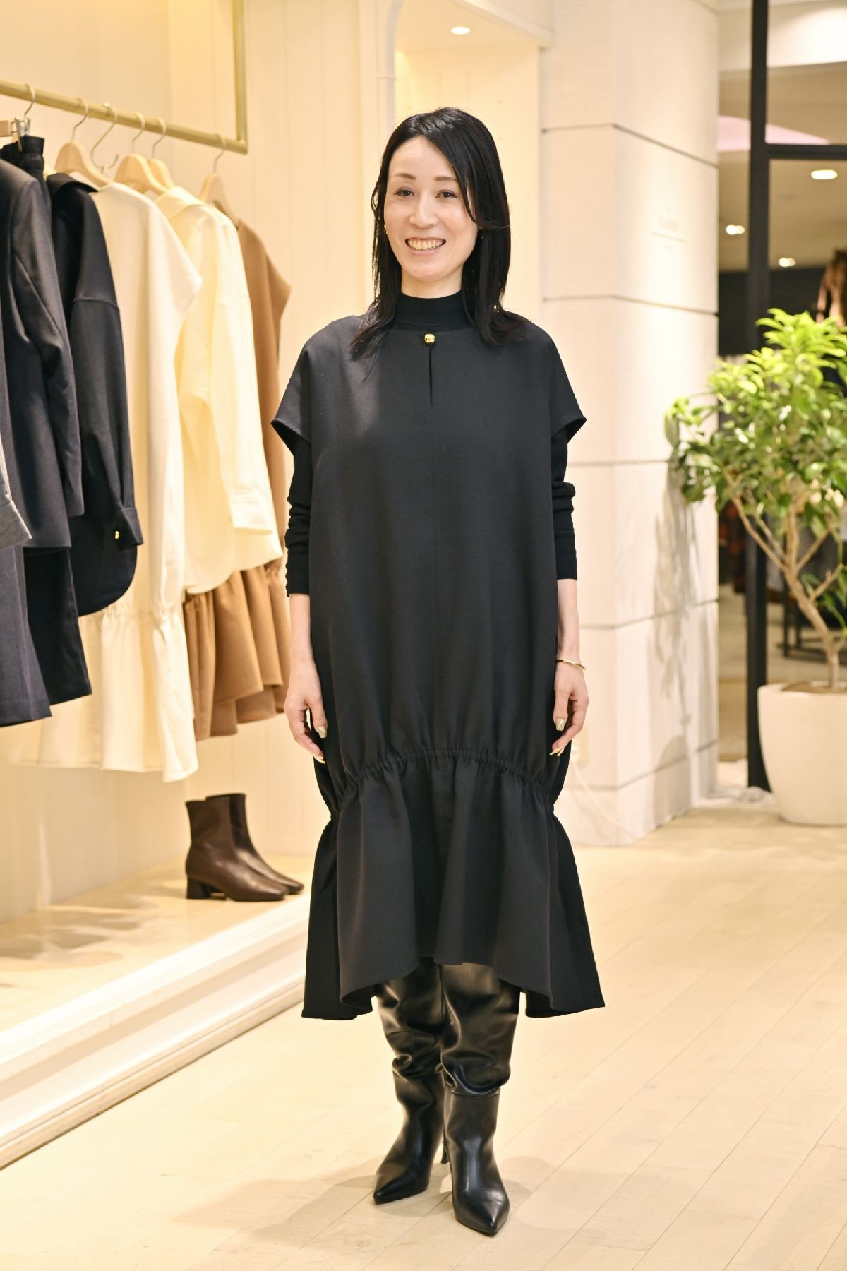 「今の40代・50代はデザイナーズブランドやラグジュアリーブランド、ファストファッションやセレクトショップなど、ファッションの変遷を経験してきました。私もそうですが、ファッション経験や年齢を重ねた今の自分に似合う服が着たいと思っても、そういう商品や買う場が少ないんですね。ハイブランドにはあっても、価格の桁が違っていてそうそうは買えなかったりします。だからこそ、今の空気感ときちんと感が備わっていて、ビジネスやオケージョン、お出掛けなど様々なシーンに着回せるクオリティーの高い服を、買いやすい価格で提案していくことが大事だと思いました」と原田さんは話す。24-25年秋冬コレクションはあえて品番数を絞り込んで展開し、通販や実店舗での反応を分析した上で、25年春夏シーズンでMDを本格的に組み直し、現在は25-26年秋冬コレクションを展開中だ。