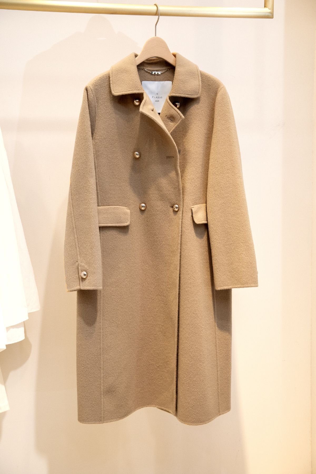 「ピュアウールリバー・ダブルブレストロングコート」(ベージュ)