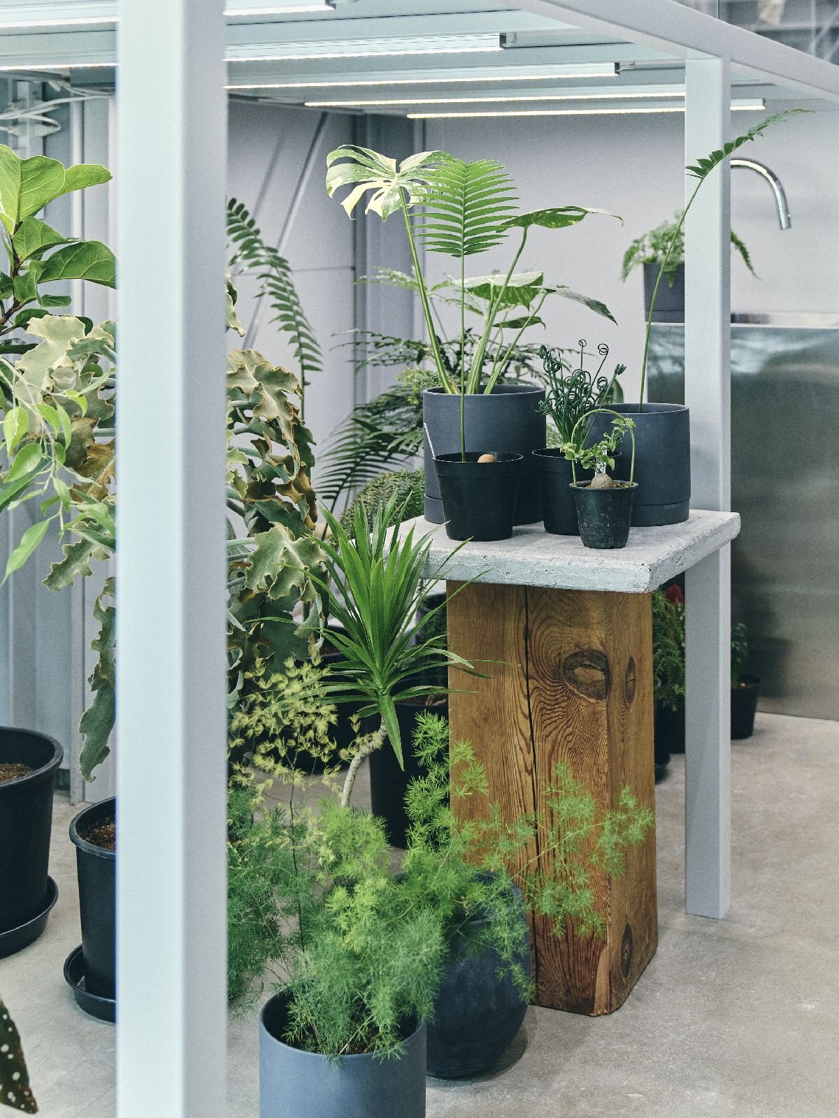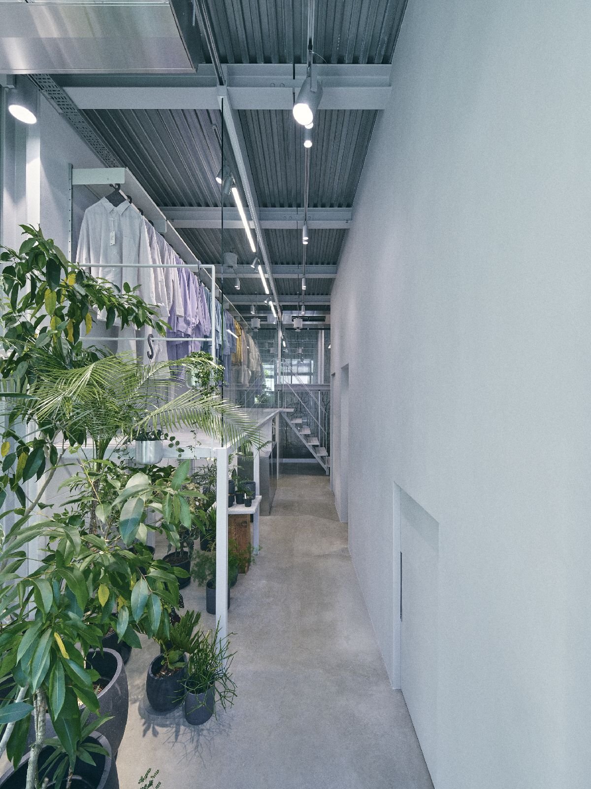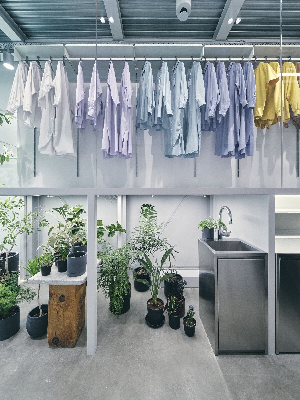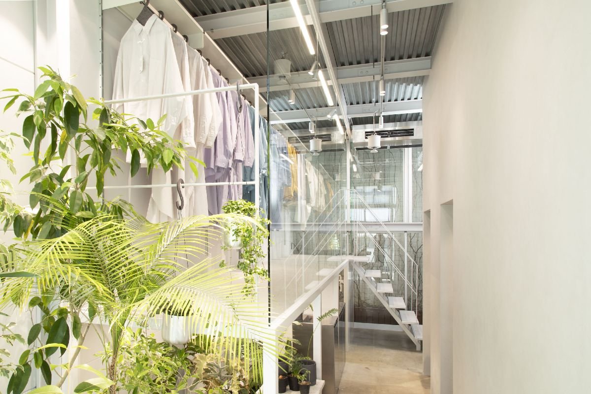店舗は奥渋谷の富ヶ谷の商店街にあり、近年はカフェやセレクトショップなども多く出店し、繁華街の喧騒と距離を置いた大人の街として人気のエリアだ。売り場面積は約25㎡だが、天井高は3.75mと吹き抜けのように開放感がある。この高さを生かし、売り場の半分ほどを2層構造に改装し、ガラス張りにすることで温室がイメージされる中2階スペースを生んだ。グレーがかったモルタルの床と白く塗られた壁面、ステンレス製のシンクなど無機質な空間の1階には「生き物としての植物」、中2階には「身にまとう衣服」が陳列され、店内に入ると両者に共通する自然が視界に立ち上がってくる。