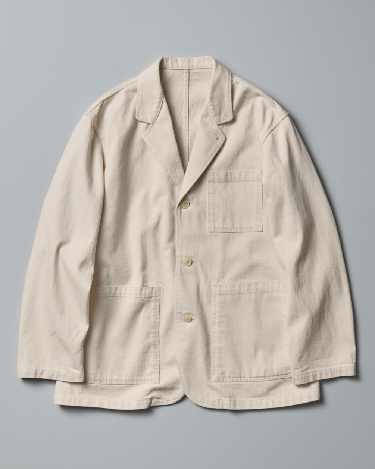 服や素材の循環に着目し、製造工程で出た産業廃棄物を再利用して作られた生地によるアイテムも揃えた。採用したのはアメリカのデニムメーカーCone Denim(コーンデニム)製のリサイクルコットンツイル。3カ所にパッチポケットを付け、切羽を省くことでワークウェアスタイルに仕上げたジャケットと、ボリュームのある腰回りから裾にかけて緩やかなテーパードを描く2タックのイージーパンツがあり、セットアップでも楽しめる。「残反や裁断片も背景や工程の一部として捉え直し、素材にあらためて意味を与える試み」という。