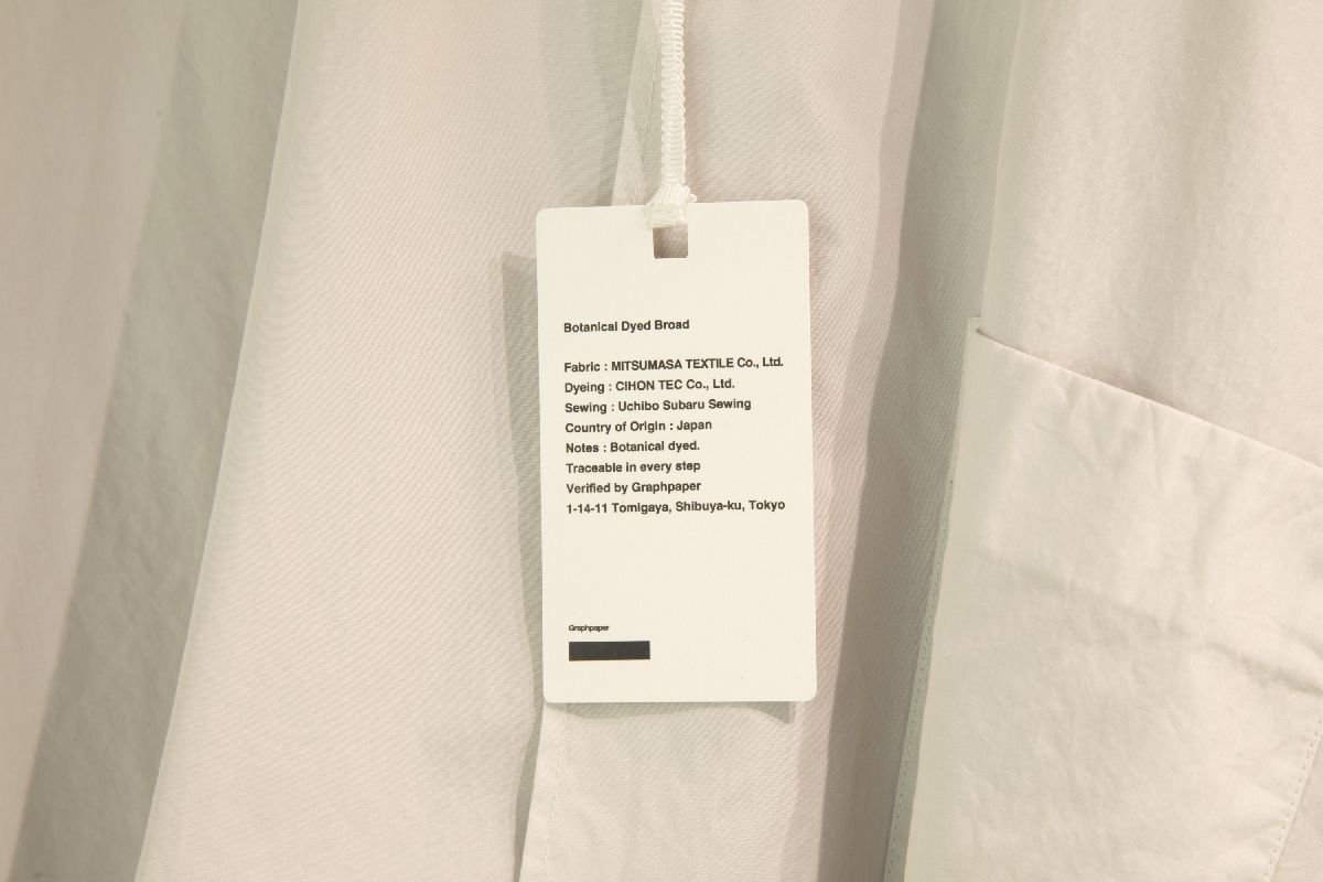 いずれもシンプルでナチュラルなデザインなのは、「『今、なぜこれを作るのか』から出発し、グラフペーパーの服からさらに引き算をしたプロダクト」だから。グラフペーパー マイナスというレーベル名の所以だ。服が作られ、流通し、その後までを含めてデザインと捉え、「必要なものだけを、必要な理由とともに形にする」。その姿勢はタグにも表れている。自然素材の生地に環境に配慮されたインクを使い、生産国はもとより、生地や染色、ニッティング、縫製などに携わった会社の名前をプリントして生産背景を明示している。また、ハンガーには廃棄衣類や廃棄繊維をアップサイクルした循環型リサイクルボードを採用。ショッパーも無くし、グラフペーパーのシャツ用のコットン生地の残反で作ったトートバッグを購入してもらうスタイルを採る。