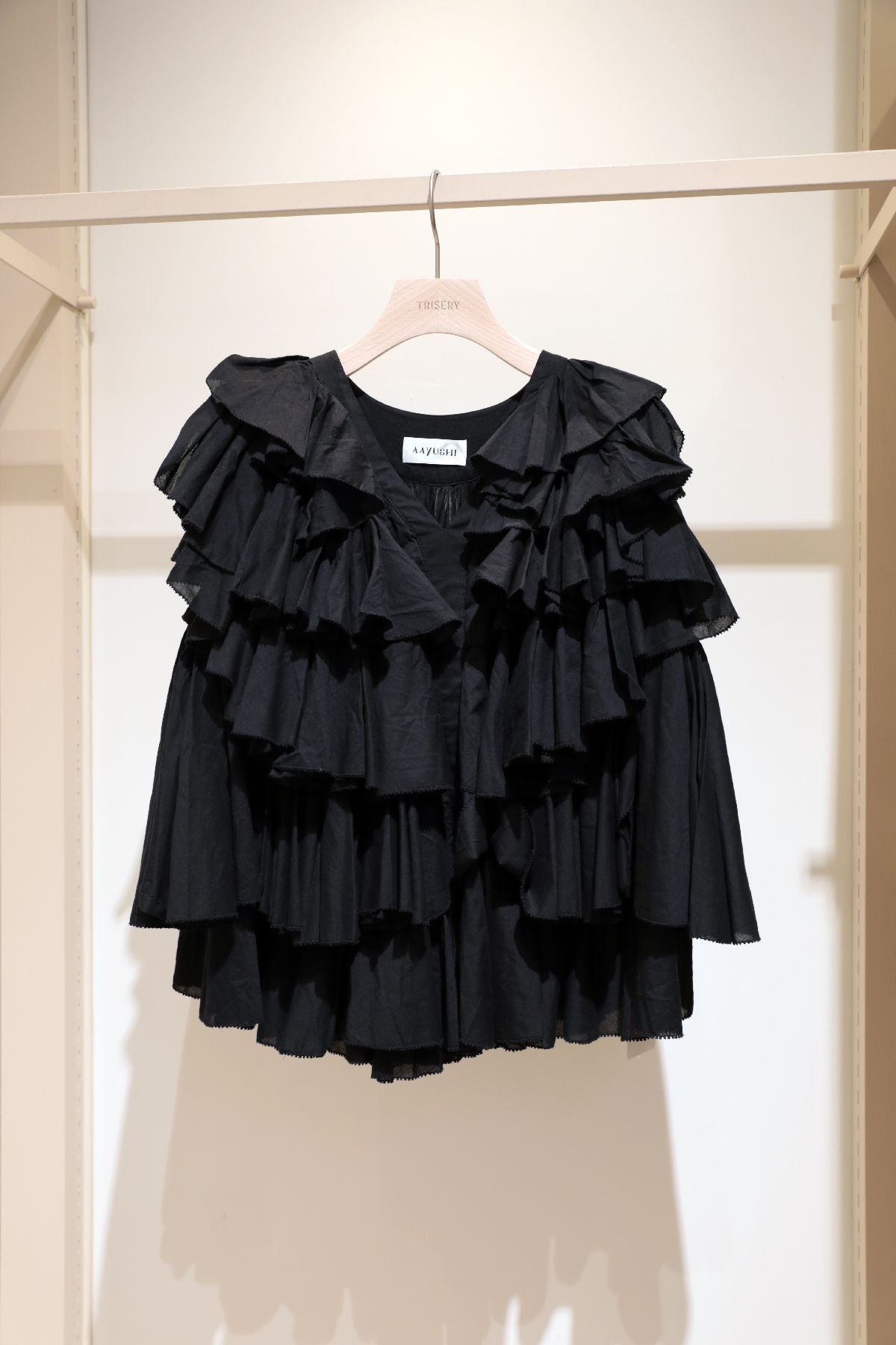 カットワークやレース、刺繍などインドの伝統技術で開発した素材による「AAYUSHI(アユーシ)」のワンピースやブラウスも注目だ。三宅一生に師事したデザイナー青木計のディレクションで24年にデビューしたブランド。ワンピースはミルコットンボイル素材を使い、手描きのデザインから作り込んだウェーブレースが新鮮で、バンドカラーとフレアのシルエットにより上品でタイムレスな1着に仕上がっている。同素材のVネックブラウスは、フロントのティアードフリルがフェミニンで華やか。背面でたっぷりと寄せたギャザーにより、着る人の動きに合わせて優美なフレアシルエットを生む。
