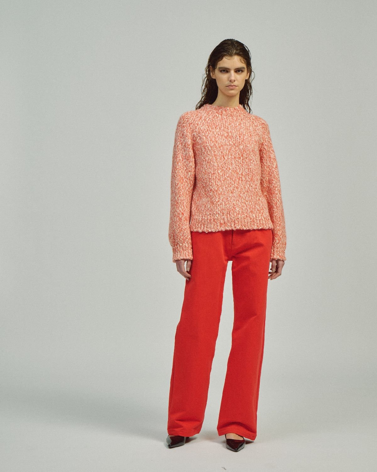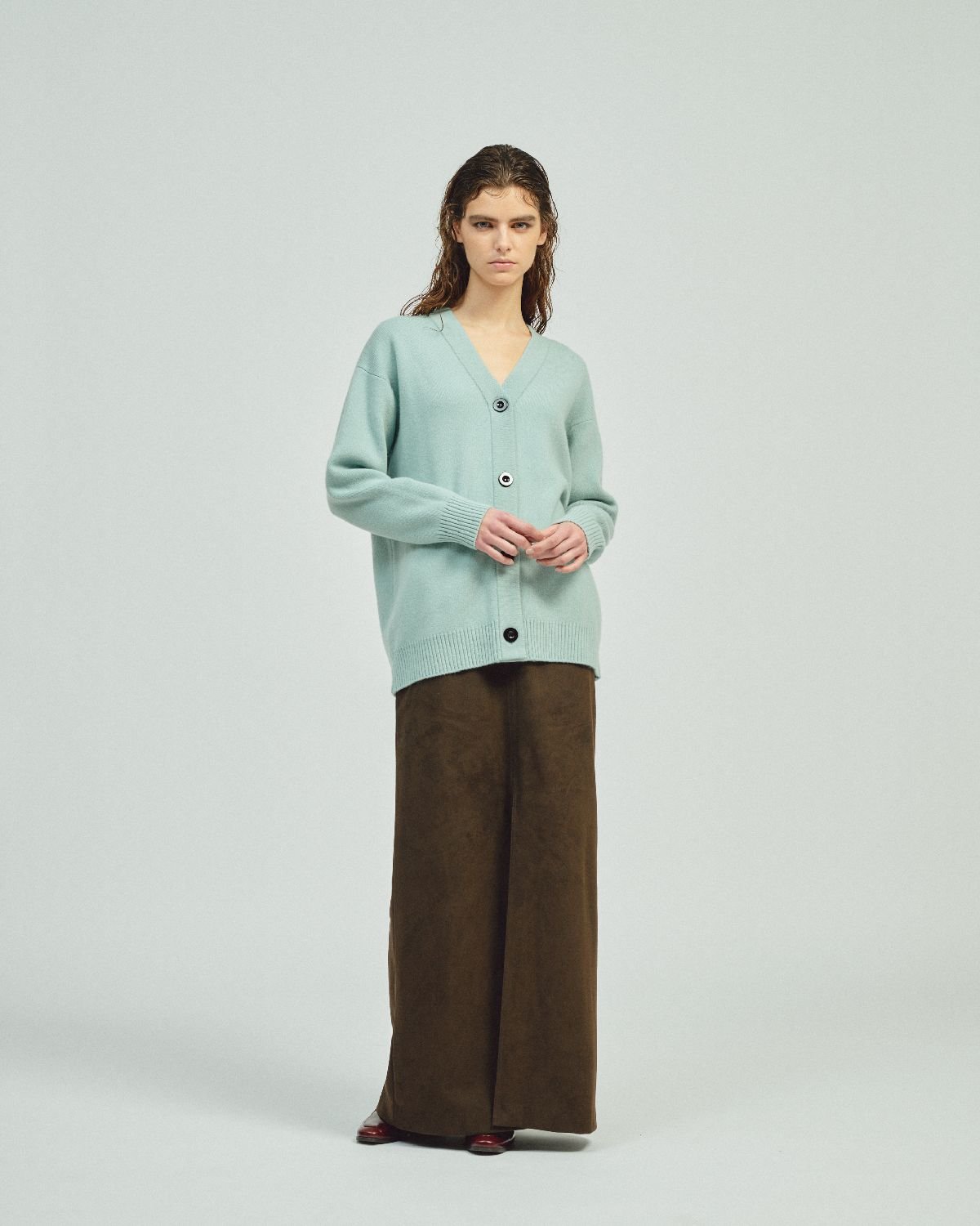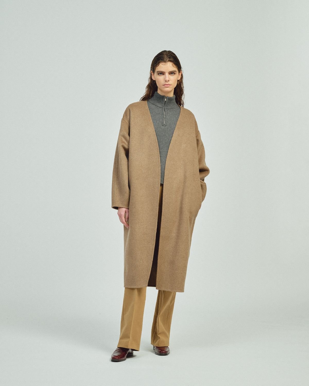 25-26年秋冬シーズンも、そうした出会いから生まれた粒選りのアイテムが揃う。例えばカシミヤのロングコート。「最高級のカシミヤ100%で極上の肌触り。750g/mという聞いたこともない目付けで、シワにもならない。たまたま出会えた」と即仕入れ、両面リバー仕立てのコクーンシルエットのロングコートを作り上げた。ミニマルながら大人の女性のエレガンスを醸す上質な一着だ。アルパカ素材を全体に使ったロングコートも注目。シングルボタンの洗練されたスタイルで、襟を立てるとレザーが現れ、高級感をプラスする。