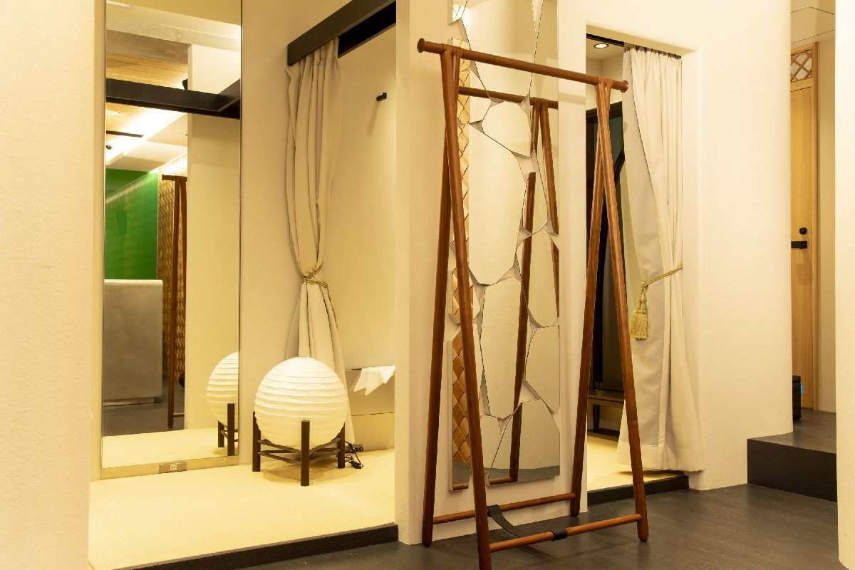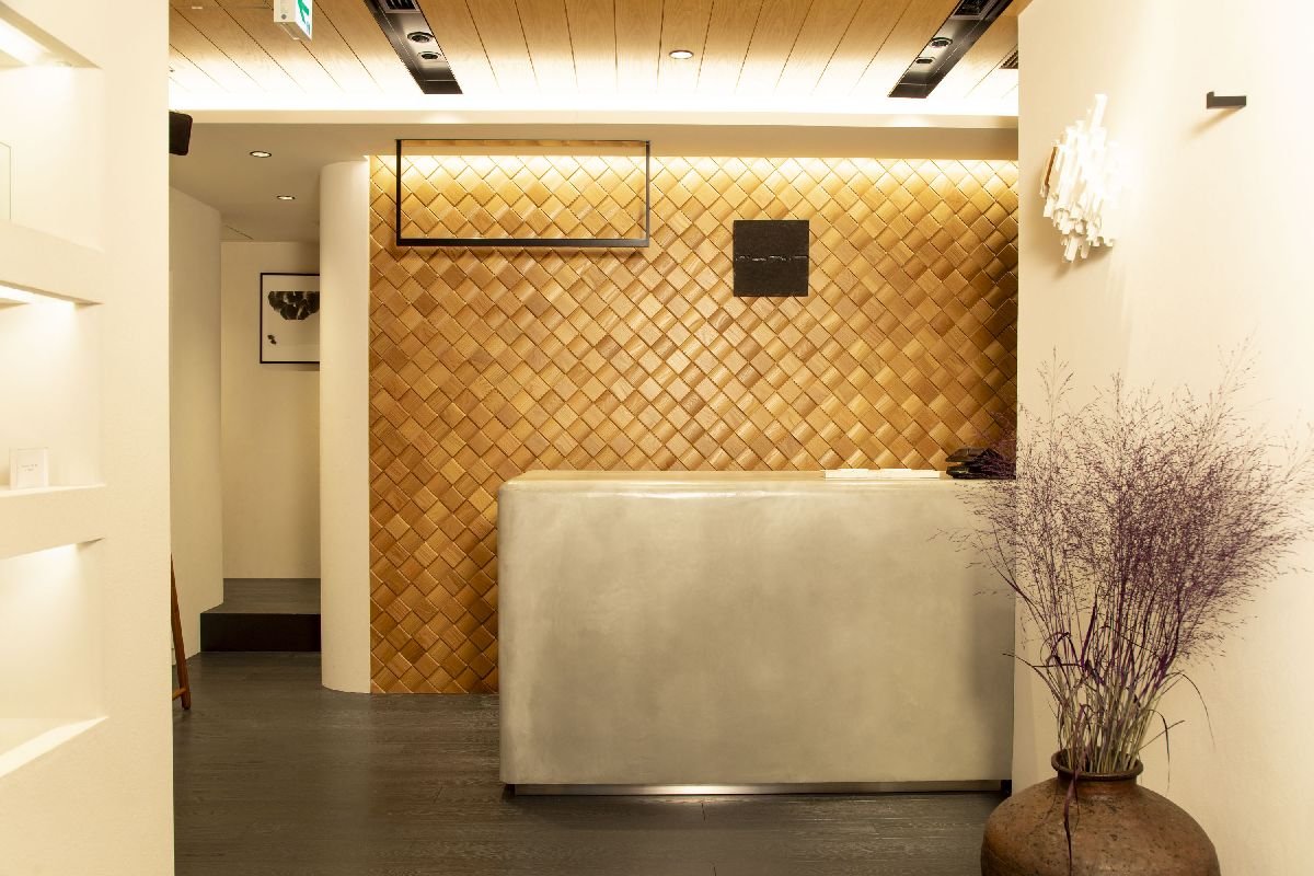 店舗面積は約80㎡。正面の3分の2ほどが売り場で、晴れた日には自然光が心地良く差し込む。床と天井に自然木を張り、白を基調とした壁には漆喰を施し、壁面下には玉砂利を敷き詰めた。洋と和が静謐に融合した空間だ。その中央に大きなソファとローテーブルを据え、「居心地の良いリビング」を出現させた。服はコーディネートをお薦めする数点ごとに固めてゆったりとラック掛けし、「ソファで世間話をしながら商品を眺め、買い物も楽しむような空間」となっている。店奥のレジカウンターは石のオブジェのよう。背景にはレザーの編み込み技法「イントレチャート」を木のパーツで表現した壁を設えた。左手には琉球畳を敷いたフィッティングルームを備える。