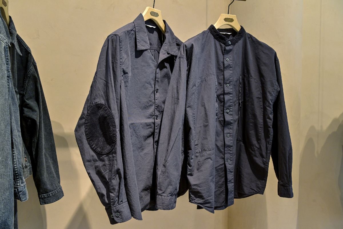 オーガニックコットン使いでは、「ORGANIC COTTON COUNTRY SHIRT(オーガニックコットン カントリーシャツ)」も目を引く。インド産オーガニックコットンを兵庫県西脇で高密度に織り上げたブロード生地で仕立てたシャツに、コーデュロイの肘当てを配したシンプルなデザインだが、脇のガゼットや袖口のイッテコイ始末、背のゆったりとしたアクションプリーツにより上品な佇まいと可動性を確保。国内で縫製したシャツに製品染めをすることで生地目を詰めてハリを強めた。着用を重ねることでコットンとコーデュロイのコントラストが深まり、風合いが増す。スタンドカラータイプもあり、こちらは襟にコーデュロイを施した。