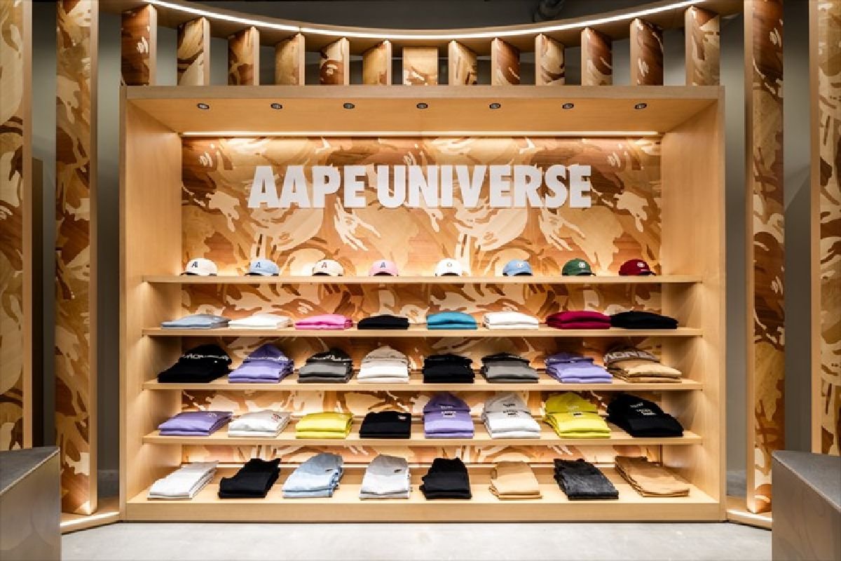 店内はグレーのコンクリートフロアと、天井および中央ディスプレイテーブルに織り込んだLEDライトの柔らかな光を調和させ、クリーンでモダンな雰囲気を演出。ウッド素材のカモ(CAMO)柄ルーバーパネルが温もりと質感を加えている。キャッシャーカウンター上には「エーエイプ」の象徴「Moon Face」ライトを円形に浮かべ、空間全体を静かに照らす。