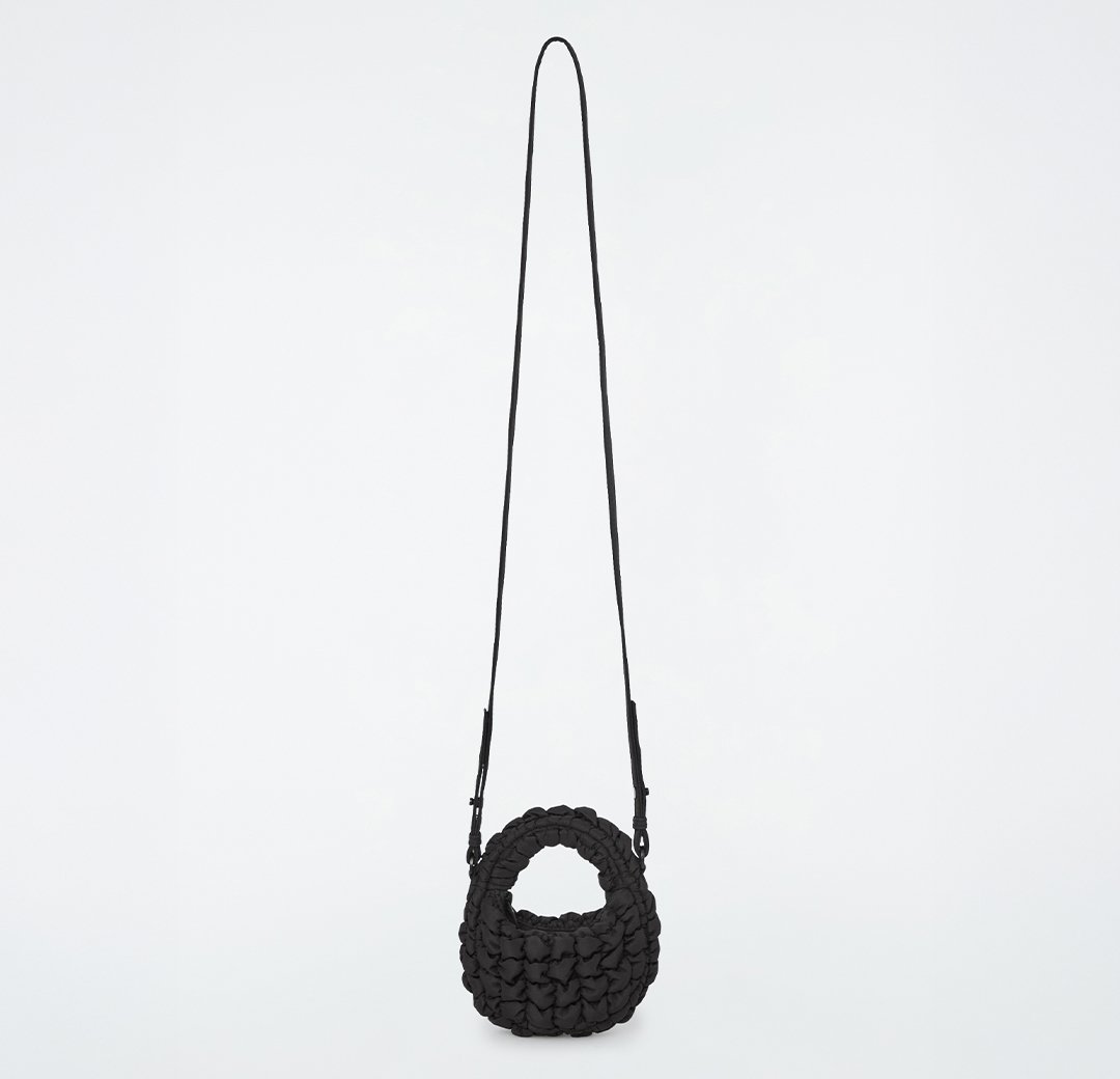 コレクションの要ともいえるキルトバッグのナノサイズは、特徴的な枕のような質感のリサイクル生地を使用し、小さな必需品が収まるサイズに仕上げられている。ショルダーストラップでクロスボディーにしたり、同系色のループで大きなバッグとつなげたりして、レイヤードバッグとしても使用可能だ。