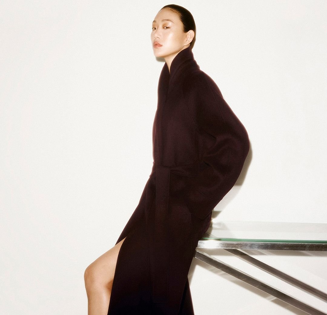 今回のポップアップストアでは、阪急うめだ本店にて使用したインテリアを再利用し、コスが掲げるサステイナブルな取り組みを推進している。アルミニウム製のスリムなハンガーレールを採用した什器に加え、イタリアの「Paper Factor(ぺーパーファクター)」によるカスタムメイドのテーブルを設置。このテーブルは、合板に加えリサイクルセルロースファイバーや天然顔料を使用した複合素材で構成され、空間に立体感と奥行きをもたらしている。