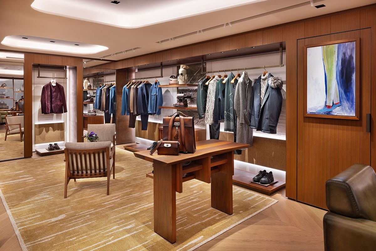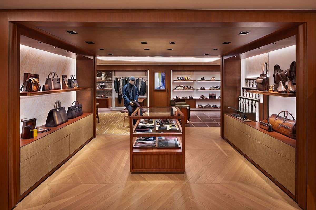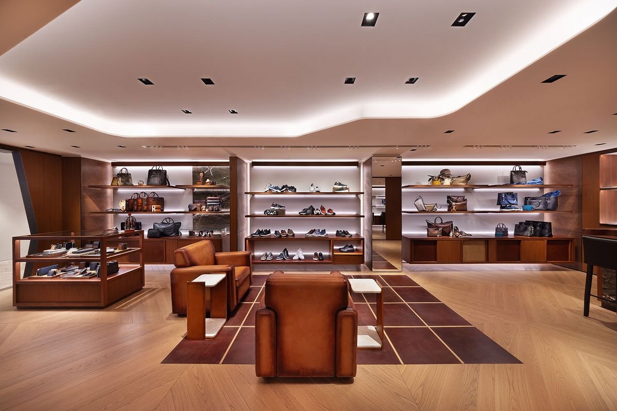 ベルルッティで「シューリング」と呼ばれる、正方形のレザーパネルが敷かれたシューズの試着コーナーは2か所に配置され、メゾンならではのユニークなシューフィッティングの儀式が執り行われる。フォーマル、インフォーマル、レジャーと、異なるシーンに対応するフルラインナップをゆったりと選び、試着することができる。また、アメリカンウォールナット材の波打つような壁面は、ブティック全体に温かみのある、くつろいだ雰囲気をもたらしている。