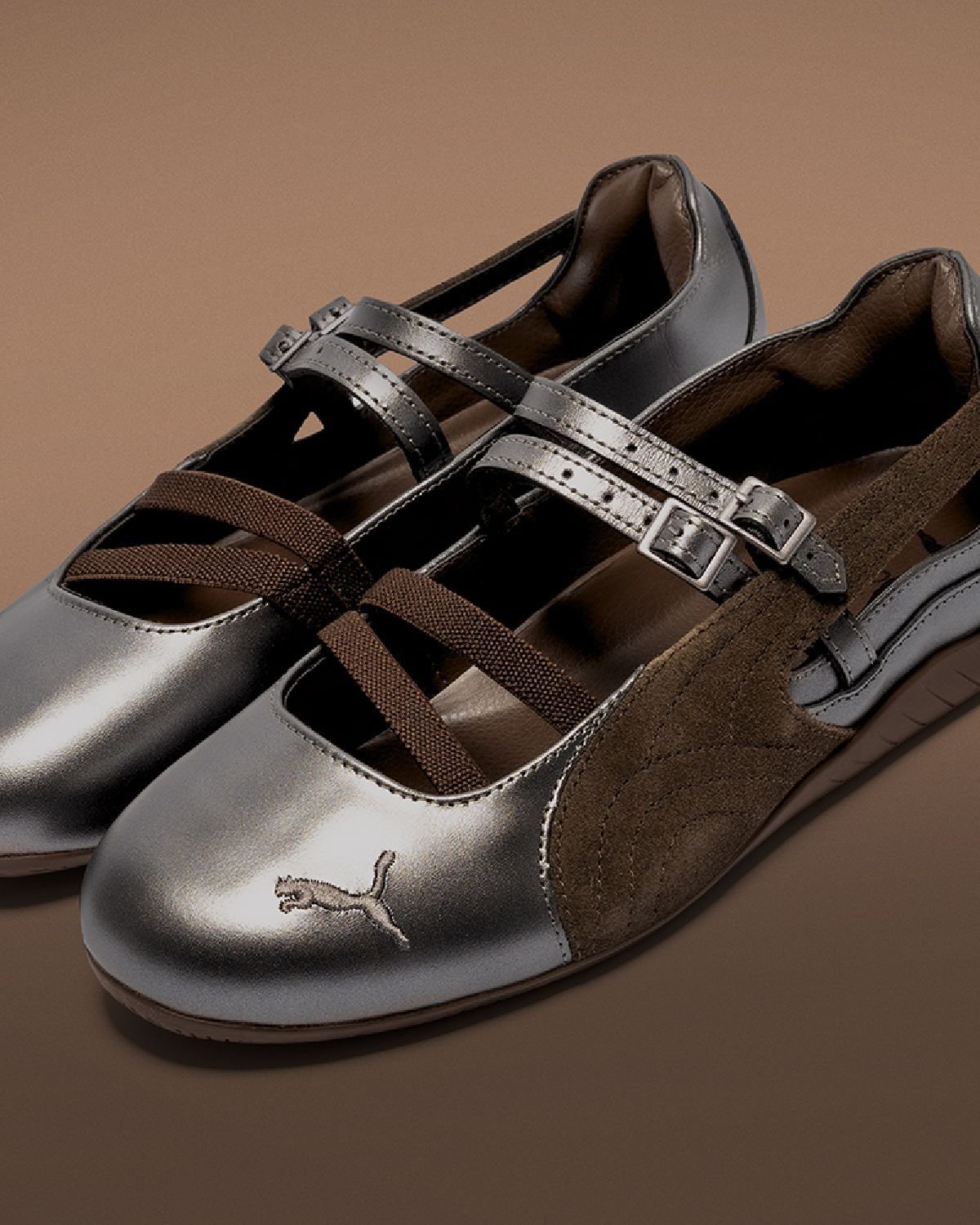 1999 年のオリジナルモデルの形状を踏襲したローカットモデルを、柔らかなブラウンスウェードとメタリックグレーのアクセントで仕上げた一足。