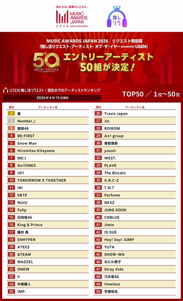 エントリーアーティスト50組のランキング途中経過(4月8日現在)を発表!リクエスト特別賞「推し活リクエスト・アーティスト・オブ・ザ・イヤー powered by USEN」 ~国内最大規模の国際音楽賞「MUSIC AWARDS JAPAN 2026」~