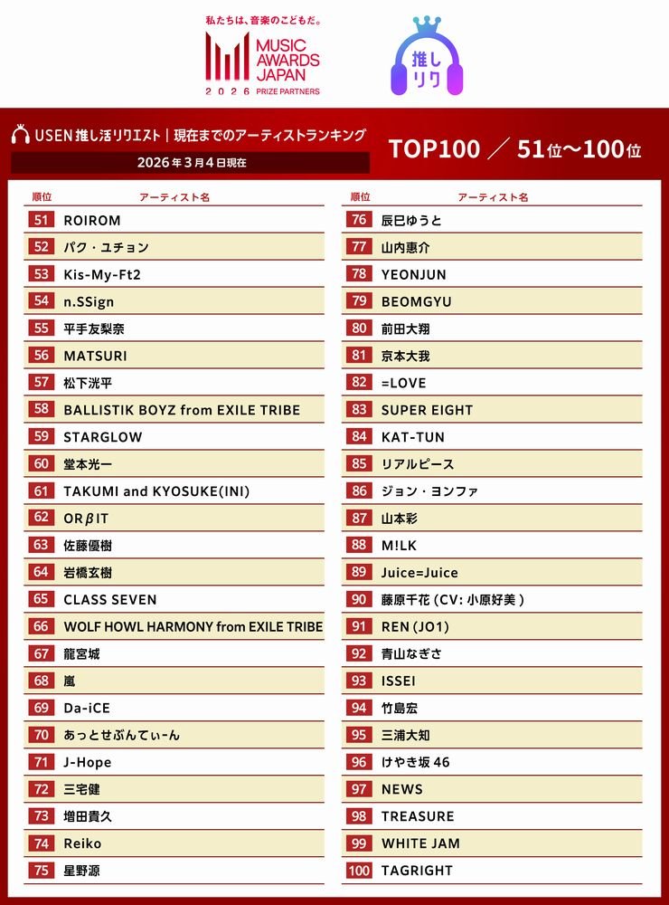 USEN 推し活リクエスト 現在までのアーティストランキング 51-100位(2026年3月4日現在)