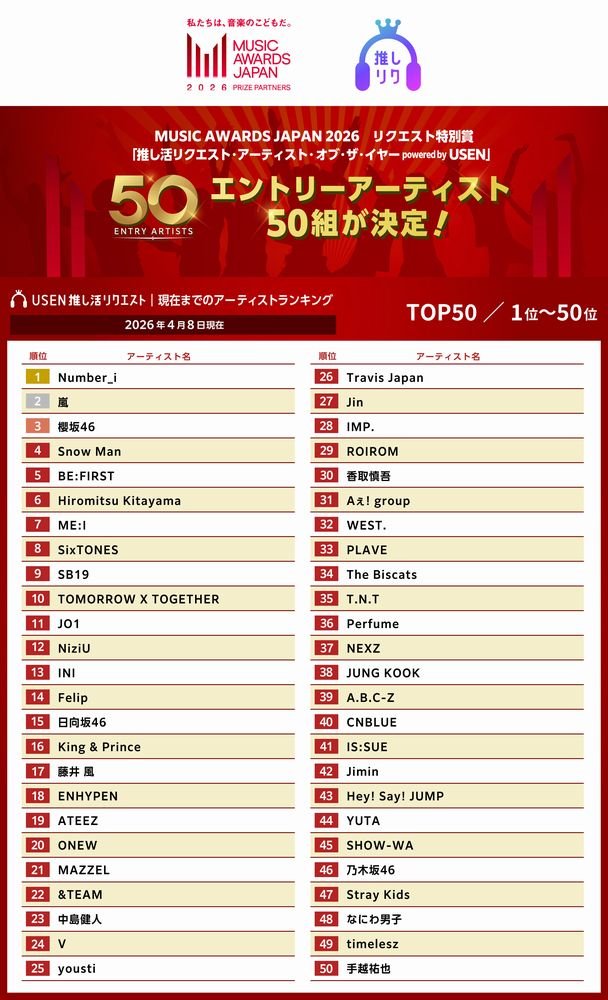 エントリーアーティスト50組のランキング途中経過(4月1日現在)を発表!リクエスト特別賞「推し活リクエスト・アーティスト・オブ・ザ・イヤー powered by USEN」 ~国内最大規模の国際音楽賞「MUSIC AWARDS JAPAN 2026」~