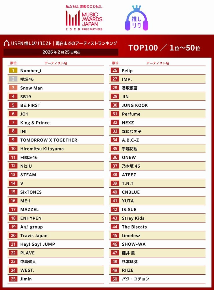 USEN 推し活リクエスト 現在までのアーティストランキング 1-50位(2026年2月25日現在)