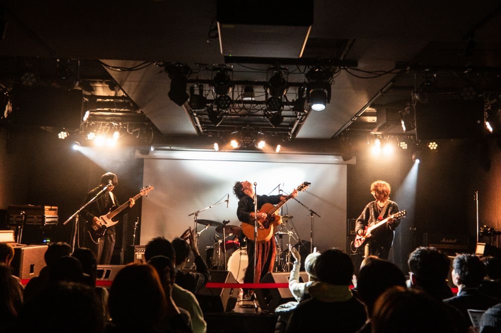MCでは場を盛り上げようと、ギター&ボーカルの古谷 蓮が「なんで座ってるんですか?卒業式ですか?」と軽く挑発したが、緊張の裏返しなのだとすかさずフォローを入れる。それを滑ったな、という風にツッコむドラムの鈴木洸太のキャラもいい。ちなみにここまで演奏した曲は4人バンド時代の曲らしく、確かにリフとソロ両方を弾く古谷はちょっと苦戦しているように見受けられた。だが、メンバーが一人抜けた今もスリーピースでバンドを再構築していることがわかると、彼らの熱演の意味もわかってくる。3人の演奏を意識しただろう「今日未明」と題された新曲はシンプルなコードで作るソリッドなマイナーチューン。ここでもベースの活躍が目を惹き、これからまだまだ変化していきそうなバンドの成長過程に出会えた。
