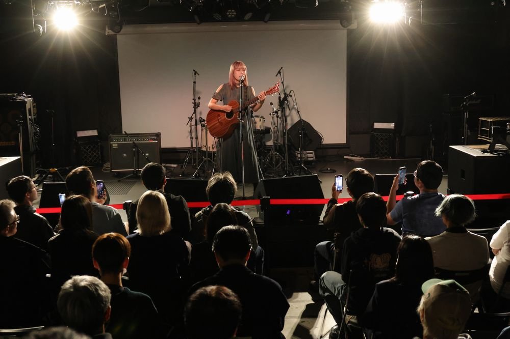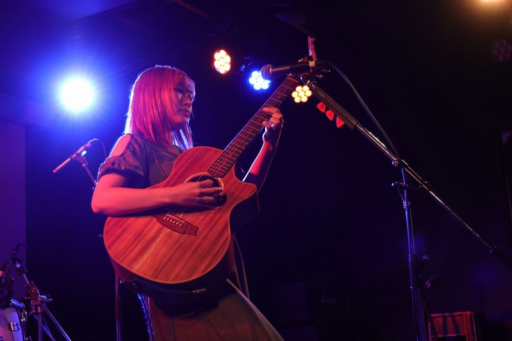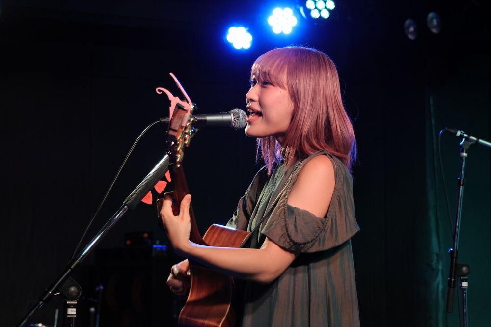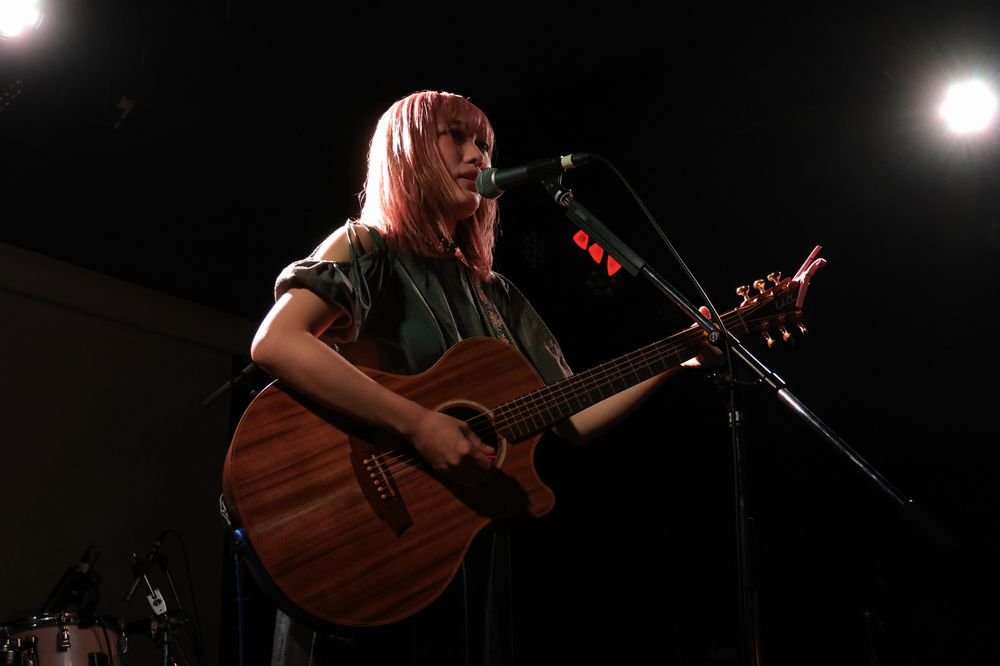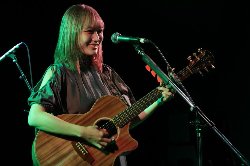 1曲目はアイリッシュな世界観もある「かたち」だ。バックにオケを流すスタイルでのギター&ボーカルのライブアレンジは珍しいが、物足りなさは微塵も感じさせない。『メイドインアビス』OP曲だが、遠くまで届く明快な歌唱が彼女自身の勇敢な物語として響く。静かな歌い出しで惹きつける「シルバーフラワールド」では緩急の多い展開で圧倒した。MCでは普段とは違うオーディエンスとの出会いも意識して「全力で歌います」と意思表明。その言葉通り、サウンドチェックでも披露した「雨のち虹」では安定したファルセットと地声の高低差を乗りこなし、「Unheard Voice」ではシンプルなオケゆえに目立つギターカッティングも力強いところを見せてくれた。さらに目下のところ会場限定CD収録の新曲「GRASSHOPPER」も披露。「ガラッと雰囲気変えていきます」と曲紹介した通り、四つ打ちのダンスチューンに伸びやかなボーカルを乗せていく手法が新鮮だ。しかもギターリフで作るフックも小気味よく、彼女がMIYAVIやKTタンストールをお手本として見聴きしてきたというのも大いに納得。ちなみにアコギ演奏ではほぼ初披露だったそうで、「緊張しました」と素直な告白も。10月29日からフル尺で配信されているので、ぜひチェックしてもらいたい。
