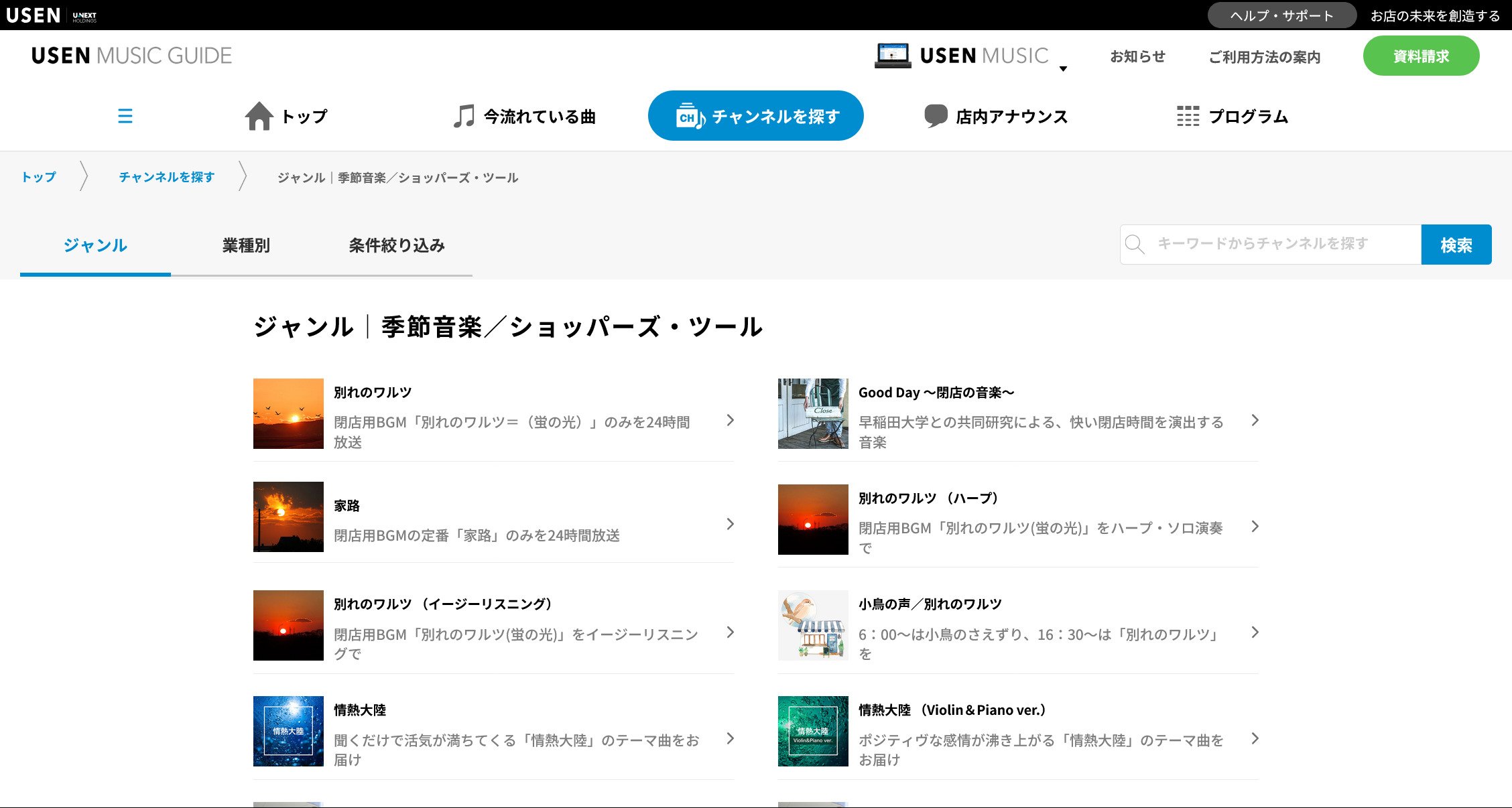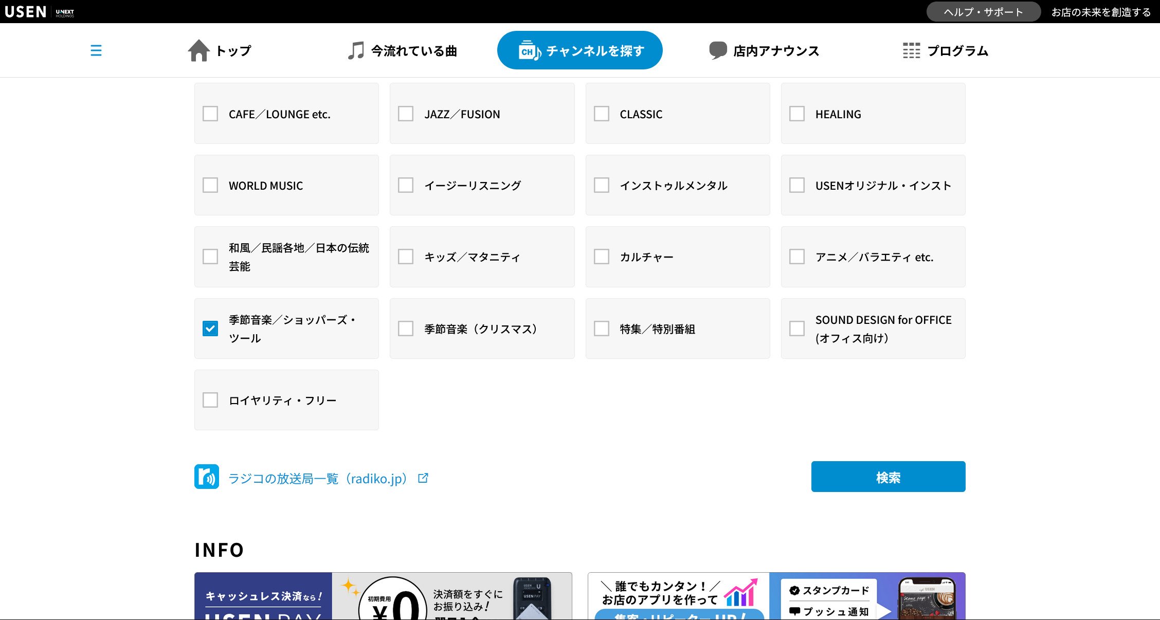 ▼「USEN MUSC GUIDE」のトップページで「チャンネルを探す」を選択 ⇒ 「チャンネルを探す」ページでジャンルやシチュエーションをチェックマークして検索 ⇒ おすすめチャンネルを表示
