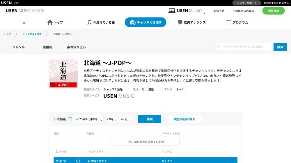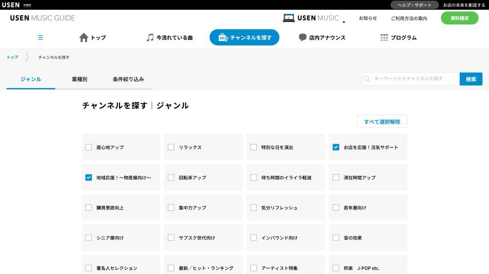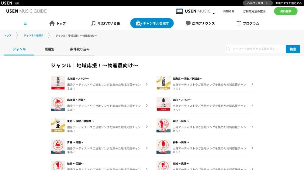 もちろん北海道、九州以外の地域についてもラインナップしていますので、「USEN MUSC GUIDE」の「チャンネルを探す」から「地域応援!~物産展向け~」を検索してみてください。