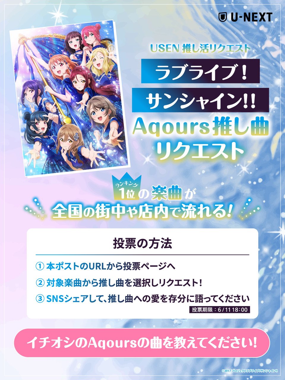 このたび、6/21(土)、6/22(日)に開催される『ラブライブ!サンシャイン!!』Aqours 9人での最後のワンマンライブ「ラブライブ!サンシャイン!! Aqours Finale LoveLive! ~永久stage~」の全公演がU-NEXTで独占ライブ配信されることに伴って、推しリクで『ラブライブ!サンシャイン!!』に登場するスクールアイドルグループ「Aqours」の推し曲リクエスト企画がUSEN推し活リクエストで期間限定で開催されることとなった。