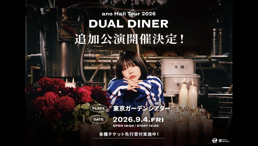 ano、自身初のホールツアー「ano Hall Tour 2026 DUAL DINER」がスタート!9月4日(金)に東京ガーデンシアターにて「ano Hall Tour 2026 DUAL DINER」の追加公演および、anoオフィシャルファンクラブ「CLUB DENTAL MOUSE」会員限定弾き語りライブ「天国未遂 Vol.1」の開催決定!キービジュアル&Teaserを公開!!チケットの詳細も発表!!