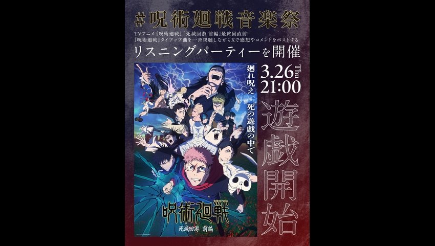 TVアニメ『呪術廻戦』歴代テーマソングのリスニングパーティー「#呪術廻戦音楽祭」が3/26(木)21:00より開催決定!