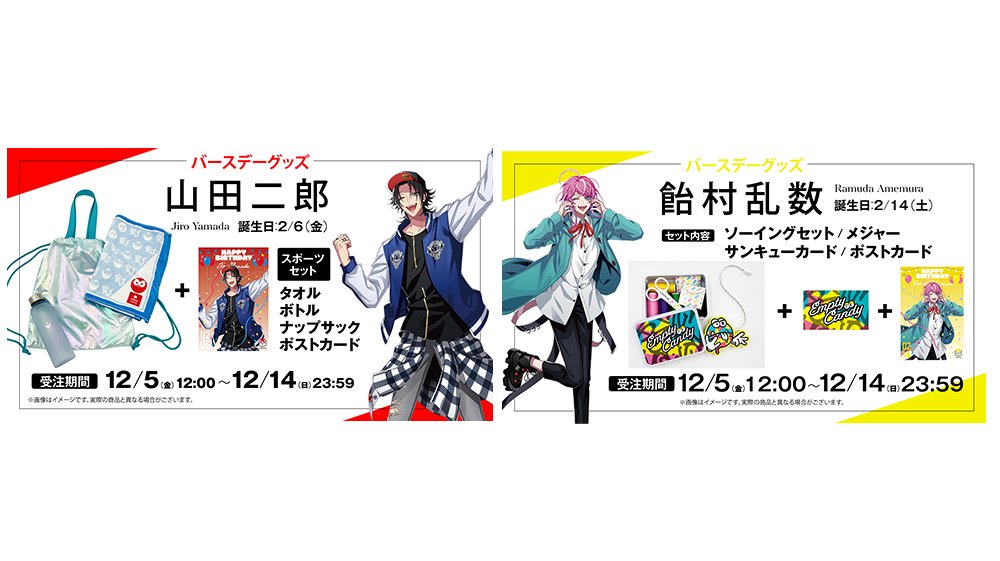 ヒプマイ イケブクロ・ディビジョン"Buster Bros!!!"、山田 二郎とシブヤ・ディビジョン"Fling Posse"、飴村 乱数の誕生日を記念し、ファンクラブ限定で描き下ろしイラスト使用の特典付きバースデーグッズの受注販売が決定!