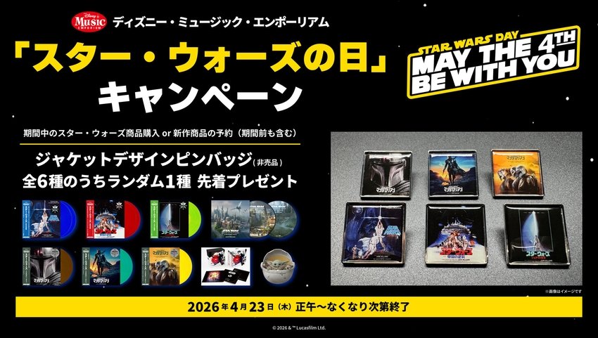 5/4は「スター・ウォーズの日」!ディズニー・ミュージック・エンポーリアムにて、4/23(木)正午よりジャケットデザインピンバッジ(非売品)がもらえる「スター・ウォーズの日」キャンペーンを開催!CDショップではステッカー・プレゼント!