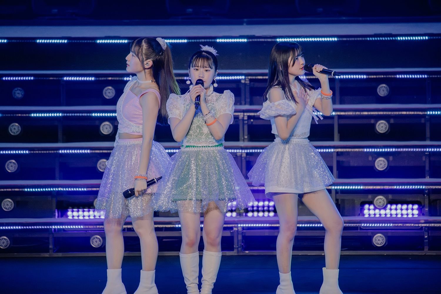リトキャメに続くのは、昨年 2 月に加入した石井泉羽、村田結生、土居楓奏の同期3人。グループでいちばん下の“ひなーず(ファンからの愛称)”の 3 人は、『私がオバさんになっても』『気高く咲き誇れ!』『青春まんまんなか!』といったインディーズ時代の楽曲を披露。次世代へのバトンの受け渡しを行っているような演出に、これからもグループの歴史を積み上げていく強い決意を感じさせてくれる。