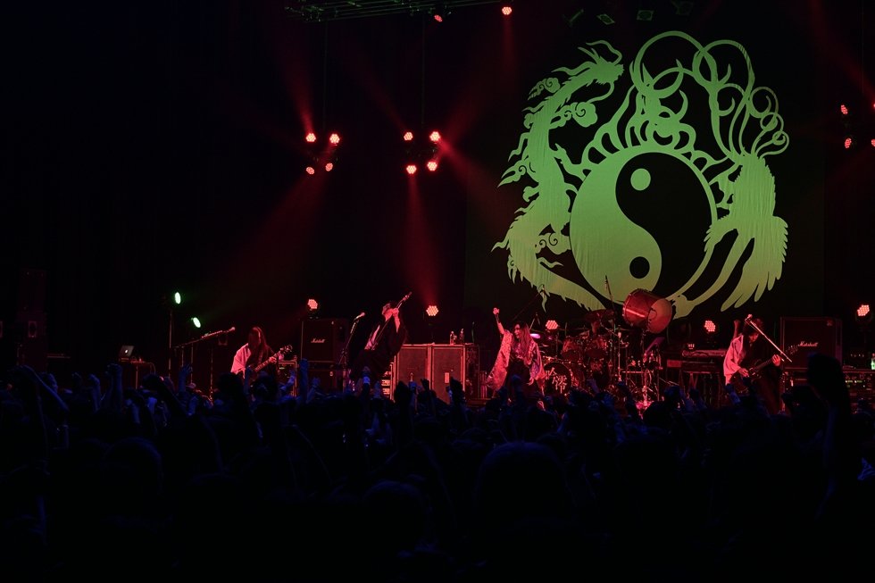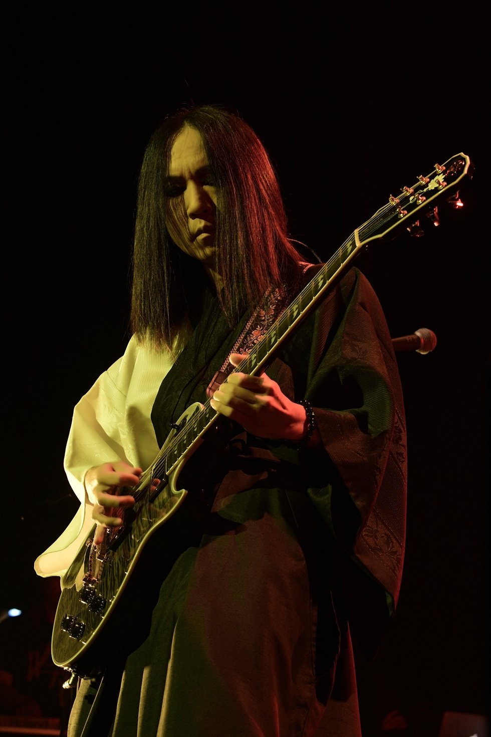 そのまま再び新作から「星熊童子」へ。酒呑童子の配下にある四天王の1人を取り上げたものだ。その逸話を瞬火流に解釈したストーリーだが、主題は裏切りに対する怒り。スラッシュ/メロディック・デス・メタルの系譜にあるアグレッシヴなサウンドとグロウルに思わず頭を振らされる。ギター・ソロの中間部にある招鬼のストロークも効果的で、こういったアレンジを含めて、文字通りの和洋折衷さを絶妙に体現する陰陽座の持ち味を改めて感じる演目でもあった。
