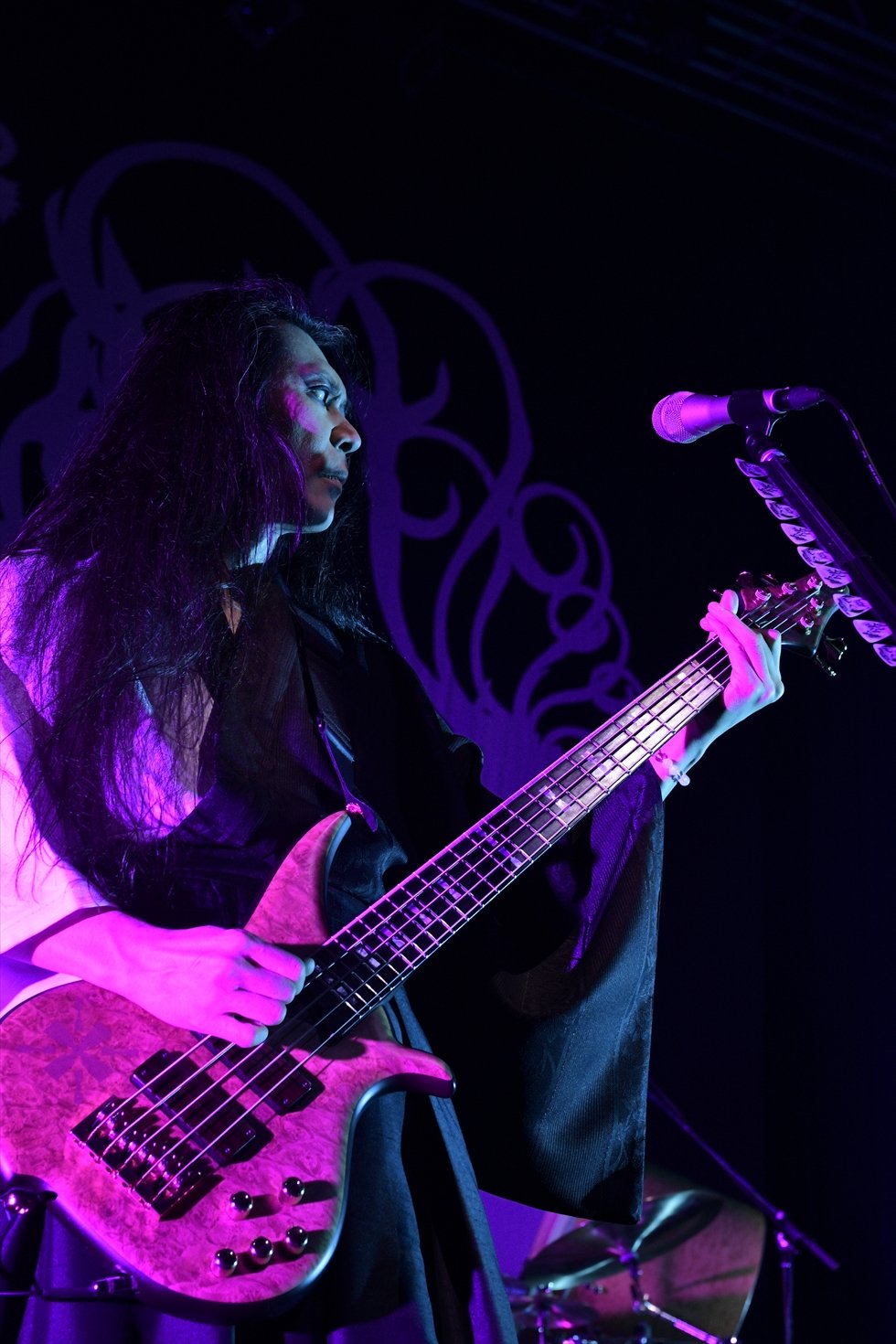 ここで瞬火が今夜のツアーへの参加に対して謝意を述べ、すぐさま「鬼神に横道なきものを」をコール。この曲名は『龍凰童子』のリリース時のツアー・タイトルにも用いられていたが、これは酒吞童子が源頼光に倒された際に発した言葉と言われている。すなわち、かの屈指の強力な鬼の一生を振り返りつつ、討伐されたときの心情などを描写した物語が綴られたのがこの曲だ。まず招鬼の弾く野太いリフがダークな世界観を先導。演奏と歌で一つ一つのプロットを的確に形象化していく。しかし、いわゆる勧善懲悪とは異なる視点で描かれているのも、作詞作曲を手掛ける瞬火の理知なるところ。じっくりと聴き込んできたオーディエンスは、具体的な光景を思い浮かべながら堪能したに違いない。