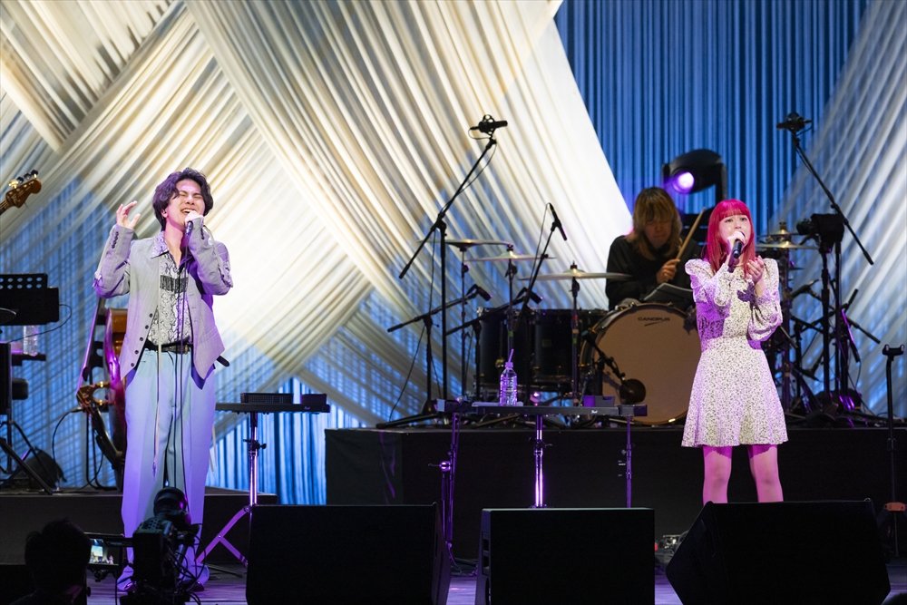 そして武部は「今日のショーでは、いろんな組み合わせのコラボレーションも楽しんでいただきたい」と語り、この日最初のコラボはGLIM SPANKYの松尾レミと亀本寛貴、そして大原櫻子の初共演。武部自身が映画音楽を担当した『コクリコ坂から』主題歌、「さよならの夏〜コクリコ坂から〜」で、松尾と大原のツインボーカルが響き合った。それぞれに違う個性のボーカルが溶け合うハーモニーは、まさにこの夜ならではのもの。