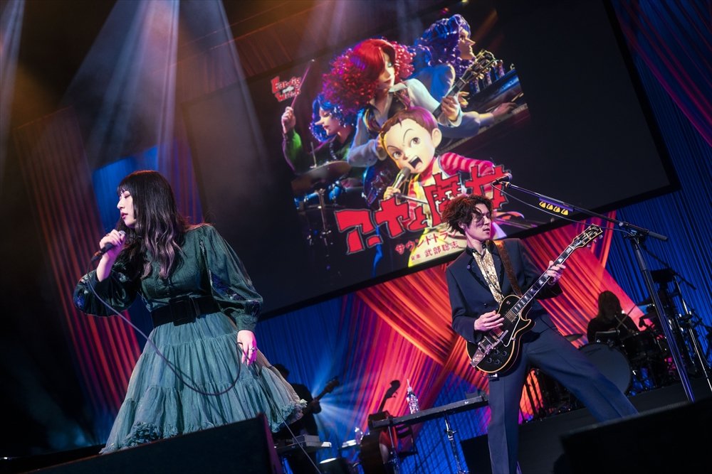 大原がステージをあとにすると、GLIM SPANKYのふたりは映画『アーヤと魔女』の主題歌「Don't Disturb Me」を披露。亀本はギターをエレキに持ち換え、強烈に歪んだサウンドで会場の空気を一気にロックのモードに塗り替える。ハードなブリティッシュロックサウンドに松尾の歌声がとてもよく合う。続いては、映画『風立ちぬ』から「ひこうき雲」を披露し、深い歌声で会場を魅了。1コーラス目は武部と松尾と亀本の3人だけのアンサンブル。2コーラス目はバンドインのアレンジで、豊かな歌世界を表現していった。