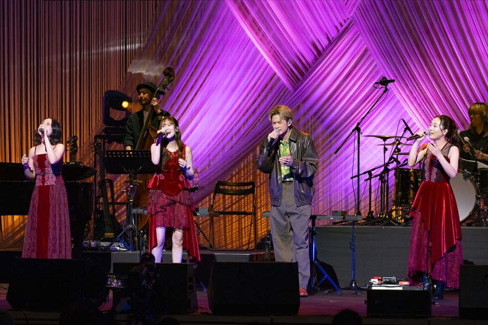 「次は打って変わって甘い声の持ち主」と武部が呼び込んだのは森崎ウィン。映画『ハウルの動く城』主題歌、「世界の約束」で透明感のある美しい歌声を聴かせる。そして武部の「次の曲はウィンくんの歌声にすごくマッチしている」という思い切り期待を高める前振りに、森崎は「歌う前に言われると緊張します(笑)」と思わず苦笑い。武部は「そういう作戦なんです(笑)」といたずらっぽく笑い、始まったのは映画『かぐや姫の物語』主題歌、「いのちの記憶」。とても繊細に丁寧に紡ぐ森崎の歌声に会場中が引き込まれる。歌い終わると武部も「素晴らしいです」と絶賛。続いてKalafinaのWakana、Keiko、Hikaruが呼び込まれ、森崎とのコラボで『千と千尋の神隠し』主題歌、「いつも何度でも」を披露。男性と女性の混声のハーモニーは、武部が4人それぞれが違うメロディラインを重ねるアレンジを施したもの。カノン的に重なり合う4人のスキャットが、とても美しいハーモニーを形作っていた。