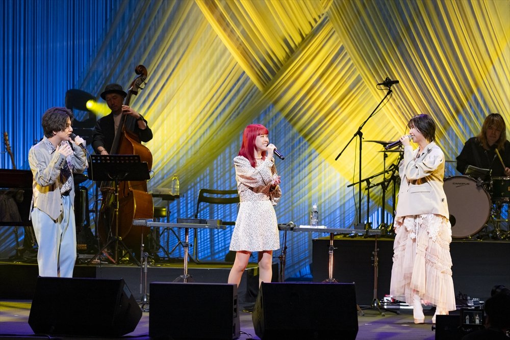 さらにもう1曲、「今度は浪岡くんのボーカルと僕のピアノが合わさるとどうなるか」と、ドラムのフィルインから『耳をすませば』主題歌、「カントリーロード」のイントロが始まる。そして大島が「増田貴久!」と呼び込むと、軽やかなバンドサウンドに乗ってNEWS 増田貴久がステージイン。増田の伸びやかな艶のある歌声が響き渡った。これもまた素敵なコラボレーション。3人のハーモニーもユニゾンも、スウィングするバンドサウンドに乗ってポップに弾ける。最後に、浪岡と増田が互いの歌声を讃えあうようにハグしたシーンも印象的だった。