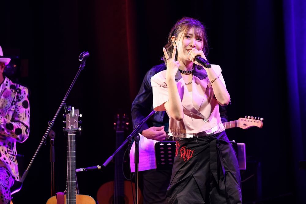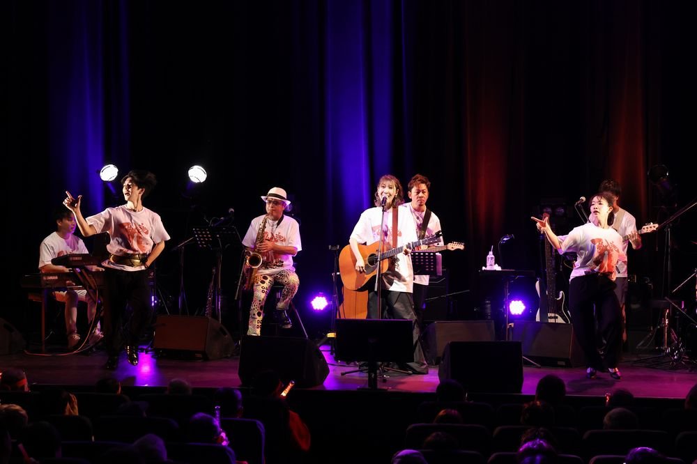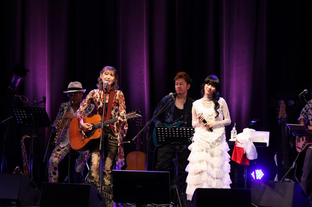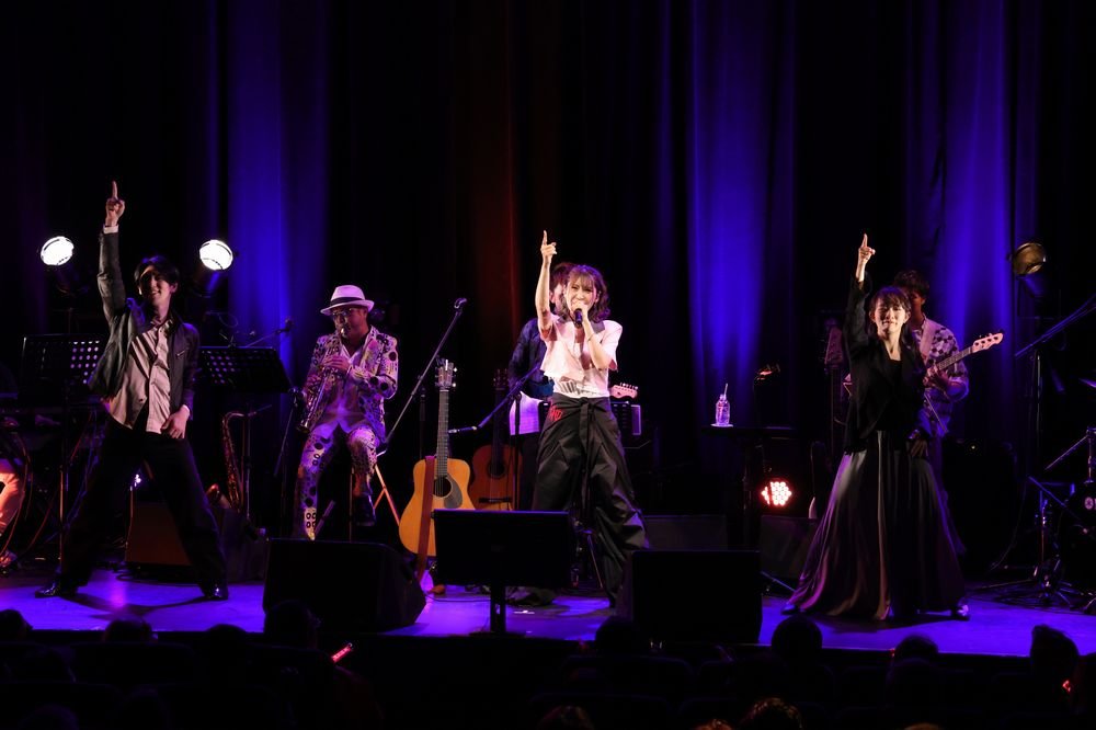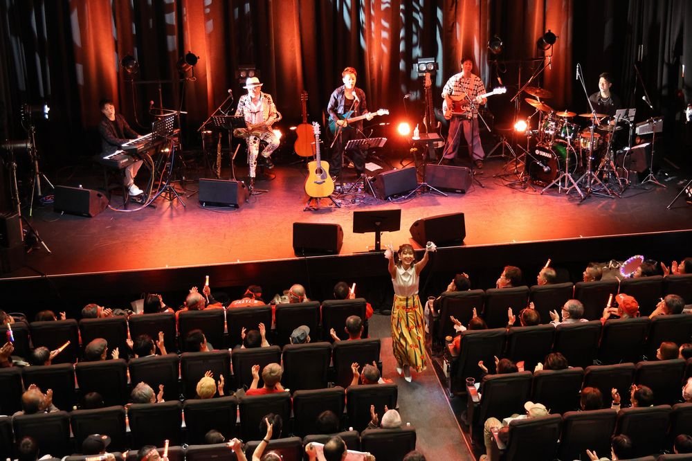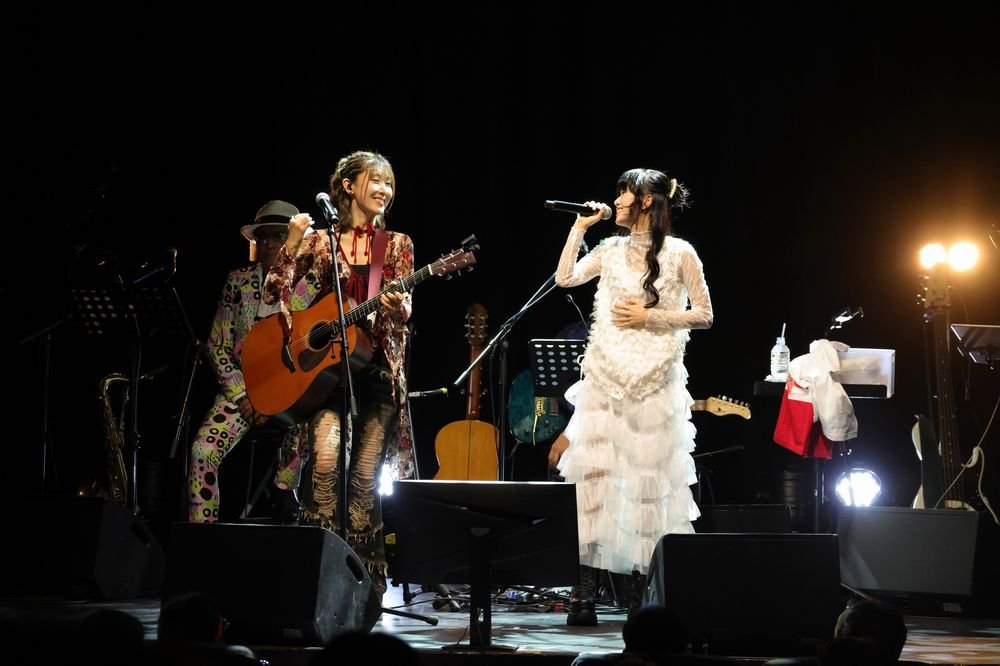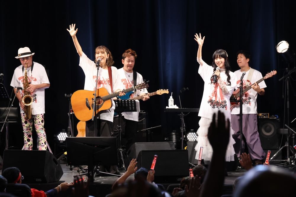 そして終盤には、スペシャルなゲストが登場。女優であり、SAKI名義で歌手としてもデビューを果たしたおかゆの妹の咲貴だ。おかゆの衣装やグッズを手がけていることでも、ファンには知られている。SAKIのデビューシングル「瞬」と、母親の口癖を曲にした「七転び八起き幸せに」の姉妹デュエットに、会場が沸き上がった。