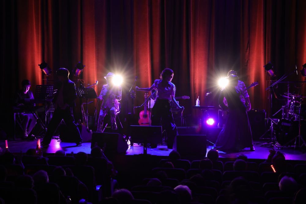 赤のハッピを身にまとい、最前列に陣取る親衛隊の熱烈なコールを受け、ライブは「シブヨル」「渋谷のマリア」「渋谷ぼっちの歌謡曲」という渋谷三部作でスタート。スペシャルなステージと先に述べたが、この日はバンドマスターとして、高橋真梨子バンドのサックス奏者、野々田万照が迎えられていた。そこには、敬愛する高橋真梨子に一歩でも近づきたいという、おかゆの切なる願いが込められている。そして男女のダンサーが登壇。おかゆの情感豊かな歌の世界に、時に激しく、時に儚く、彩りを添えていく。