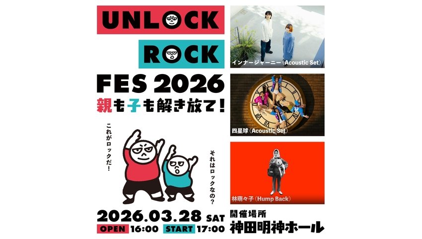 親子で"初めてのロックフェス"デビュー!3/28(土)開催の親子フェス「UNLOCK ROCK FES 2026」にインナージャーニー、四星球、林萌々子 (Hump Back)の出演が決定!